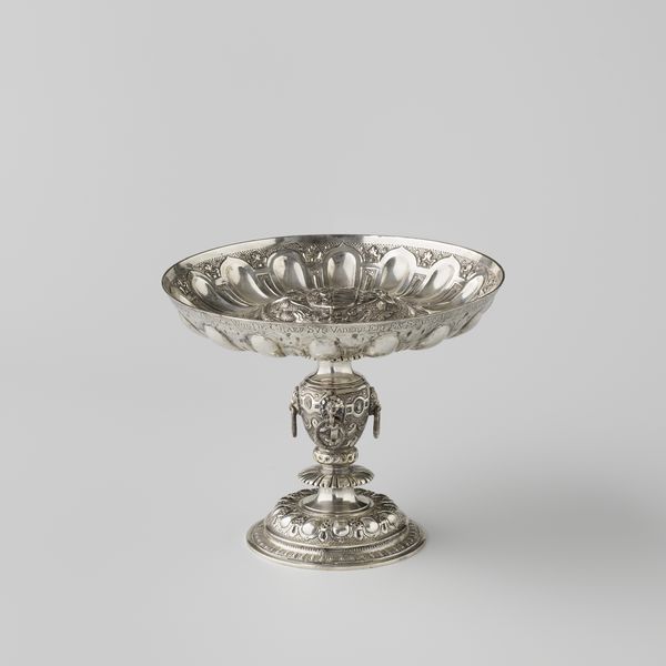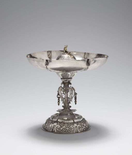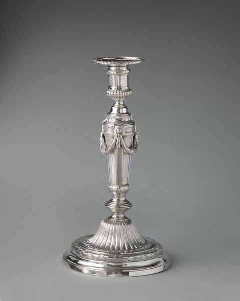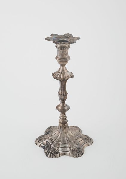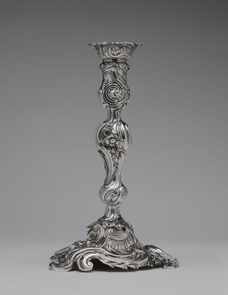 Editor: Here we have "Candlestick," a silver sculpture by William Thomson, made around 1822-1825. The level of detail in the metalwork is impressive! What’s most interesting to you about this piece? Curator: Considering its creation in the early 19th century, the candlestick's presence speaks volumes about the prevailing social hierarchies and cultural values. The intricate Baroque style, rendered in precious silver, signifies wealth and status, serving as a visual representation of power dynamics within society. Does it feel that it might reinforce these existing power structures? Editor: It definitely highlights wealth. I can see how something like this might have reinforced a family's standing or created a visual separation from the less fortunate. What's its value today? Curator: Beyond monetary value, the candlestick offers insights into the craftsmanship and artistry valued during that era. Its display within a museum setting further shapes its interpretation. We often place these objects as relics of an earlier, vanished, aristocratic class and no longer simply as everyday tools. How does seeing it here, in the museum, change the way we look at it? Editor: I guess seeing it here elevates it even more. Knowing that this object, which was already pretty precious, ended up being worthy of preservation kind of blows my mind. It seems wild that this shiny silver object might now teach a different kind of cultural lesson. Curator: Precisely. Objects like these become more than just decorative pieces, they become powerful tools of cultural narrative and the shaping of societal memory. It makes you wonder who decided which items survive and carry specific lessons, doesn't it? Editor: Absolutely! It's interesting how much social commentary can be extracted from something seemingly simple as a candlestick. I will definitely think more about objects' socio-political role in the future!