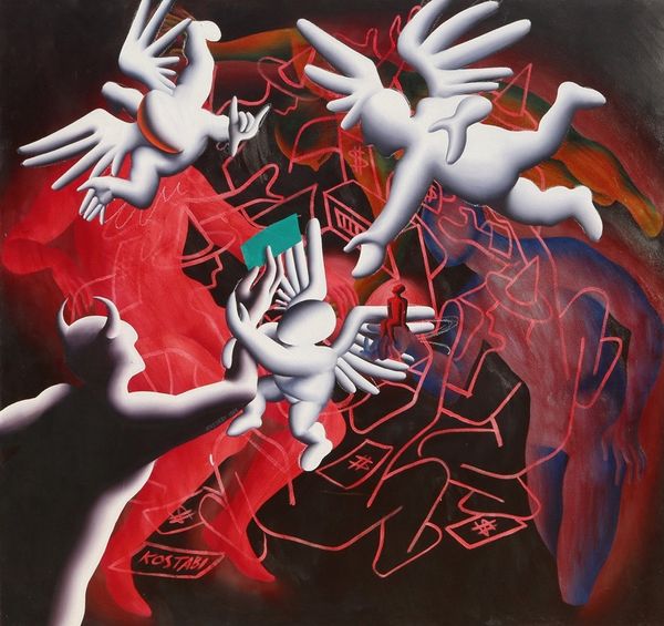 Editor: Mark Kostabi's "Cash Dance," painted in 1990 with acrylic, has these surreal figures swirling around what appears to be a bright yellow cash register. The faceless figures, combined with the floating dollar bills, gives me this slightly uneasy, almost satirical feeling. How do you interpret this work? Curator: Unease is a key feeling here, I think. Considering Kostabi’s presence in the East Village art scene during the 80s boom, and this piece emerging in 1990, we can see a sharp critique of the art market itself, and the pervasive commodification of everything. Editor: So, you see this as a commentary on the commercialization of art? The faceless figures—are they representative of something specific? Curator: Precisely. These are archetypes, stripped of individuality, consumed by the dance of capital. The vibrant colors and seemingly playful composition mask a darker commentary. Think about how the figure's anonymity highlights their role as mere consumers or producers within this system. Where is the human connection? Editor: It’s interesting to consider the historical context of the late 80s/early 90s. There’s almost a cautionary feel to the work, especially knowing what was coming. Curator: Absolutely. Kostabi holds up a mirror to our own participation in this cycle. This "dance" implicates everyone. What can art achieve if its goal is purely monetary? Is Kostabi's art offering a path to resist commodification? Or, alternatively, does his popularity reaffirm the same commercialization that it originally critiques? Editor: That’s given me a lot to consider; a darkly playful critique of a system we're all entangled in. Curator: Indeed. Art like this can stimulate introspection.