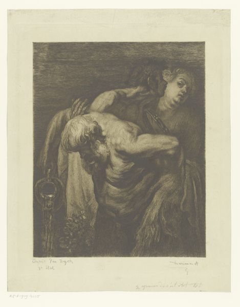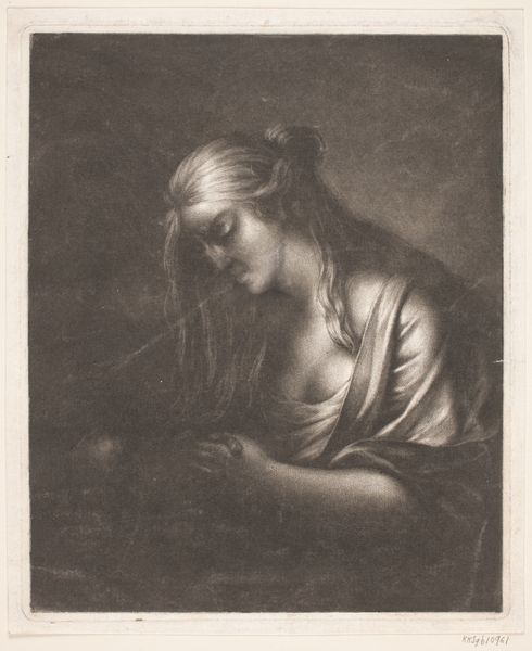 This print by Frédérique Émile Auguste O'Connell-Miethe depicts a penitent Mary Magdalene, rendered in delicate lines. Made in the 19th century, this image participates in a long tradition of representing Mary Magdalene, a figure often associated with repentance. Notice how O'Connell-Miethe uses the visual codes of the time, such as her dishevelled hair and sorrowful expression, to convey her emotional state. The inclusion of the cross locates the scene within a Christian framework. The image reflects the 19th century's fascination with religious and moral themes, often used to reinforce social norms. Understanding this artwork requires us to consider the complex interplay between religious belief, social expectations, and artistic expression in 19th century Europe. By consulting historical sources and examining the artist's biography, we can gain a deeper appreciation of the social conditions that shaped its production. It's through this kind of research that the full meaning of the artwork, contingent as it is on its historical context, can be better understood.