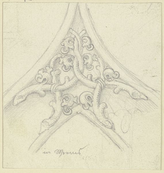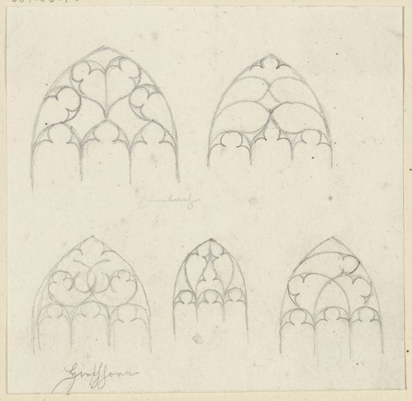Curator: At first glance, this piece feels incomplete, like a fleeting architectural vision only partially remembered. Editor: What you're responding to is Gerrit Willem Dijsselhof's "Ontwerpen voor ornamenten," or "Designs for Ornaments" housed here at the Rijksmuseum. Executed in pencil and etching on paper, likely sometime between 1876 and 1924, it embodies the essence of Art Nouveau through simple lines and forms. Curator: Art Nouveau! Yes, now that you say it, I can definitely see that in the delicate yet bold lines! There's something both fragile and confident in the way it suggests ornamentation without fully defining it. Do you think that's intentional? Editor: It’s entirely plausible. Dijsselhof, working at the height of Art Nouveau's influence, saw the societal potential of art interwoven with everyday design. Designs like these offered architects and artisans a toolkit. Ornamentation held social power, it democratized beauty by weaving it into structures for all people. Curator: Democratizing beauty... I love that thought. It almost feels rebellious, challenging the elite by bringing artistry to the masses. The use of simple shapes—triangles, arches—does make it feel accessible, like anyone could pick up a pencil and contribute. I wonder, does the museum have other works of his to see how these sketches were put into use? Editor: The museum holds other designs of his that demonstrate this desire for accessibility. By examining the collection together we see he’s investigating form itself. Lines suggest rather than dictate the parameters of our perception, the relationship between order and fluidity that encapsulates Art Nouveau's revolutionary aesthetic vision. Curator: Thinking about it, those hesitant, zig-zag lines—they aren’t just decorative, they speak to an attempt to communicate the invisible, to sketch the immaterial sensations or a mood. Like capturing the shivers that run down one's spine standing beneath a soaring ceiling. Editor: I agree wholeheartedly. These sketches whisper rather than shout. The emptiness that remains evokes the power of Art Nouveau which offered beauty for all in simple forms, so anyone can participate. Curator: What a stunning thought to end on! To leave a legacy through quiet strokes, giving birth to beautiful possibility. Editor: Exactly, an idea etched gently for us to rediscover anew.