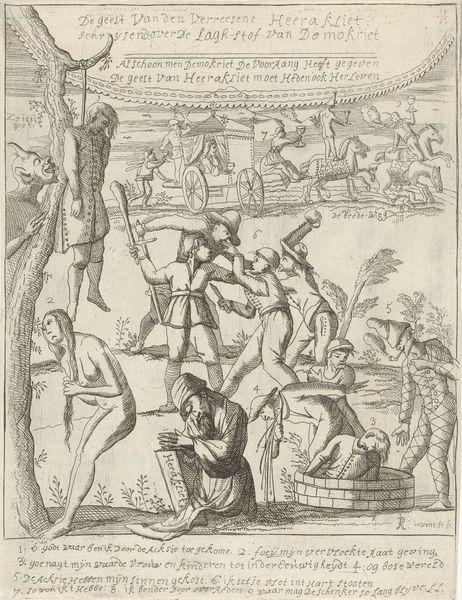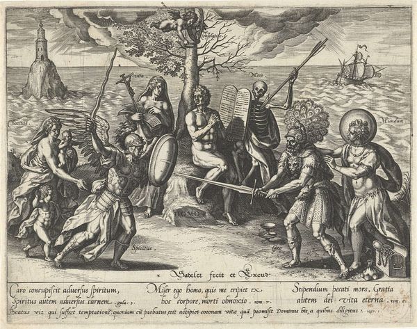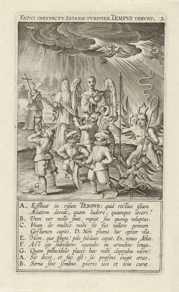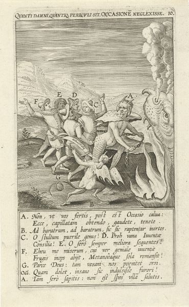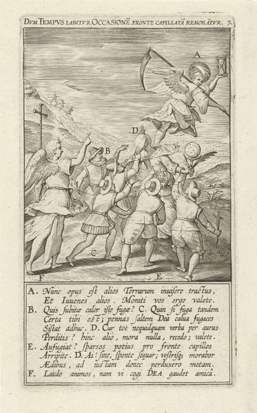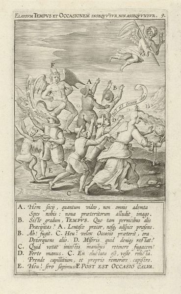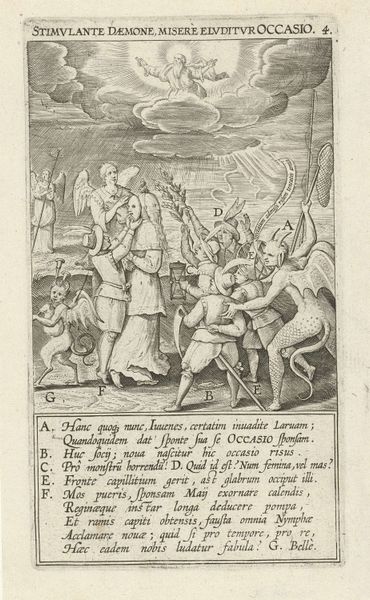 This engraving, made by Theodoor Galle, warns against the heedlessness of youth, showcasing potent symbols of time and opportunity. At the heart of the image, a winged, devilish figure looms, representing lost opportunity, specifically "Occasio". This echoes the classical motif of "Kairos," the fleeting moment one must seize, as seen in ancient Greek sculptures. In the hands of impish figures, banners declare "Gratis eritis" and "Tempus ades!", urging the arrival of time. This harks back to the Roman personification of Tempus, often depicted as an old man, reflecting the relentless passage of time. The composition recalls the dance of death, a medieval allegory, where figures are dragged along by Death, mirroring here the futile efforts to recapture lost time. The emotional resonance lies in the figures’ desperate gestures, a visual echo of humanity's eternal struggle against time's relentless march. The image’s power rests in its cyclical nature. The motifs of time and opportunity reappear throughout art history, demonstrating the enduring human preoccupation with seizing the moment before it vanishes.