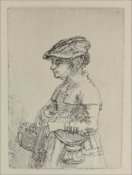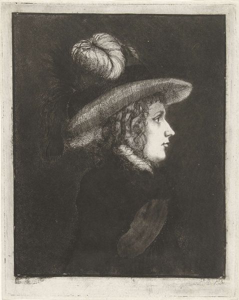 Curator: James Tissot's "Mavourneen", dating back to 1876. An etching printed on paper, held here at the Art Institute. Editor: Right away, there's a stillness that really strikes me. The intricate rendering of textures gives an almost photographic realism to the work, yet her averted gaze suggests an internal world we're not quite privy to. Curator: The magic of Tissot, right? This piece encapsulates the artist’s engagement with depicting modern women and their lives in a changing social landscape. Etchings like these allowed for broader distribution, reaching audiences beyond the traditional salon. Editor: It's amazing to think of the process itself, too. Etching isn't exactly spontaneous. Each line painstakingly laid, the bite of the acid carefully controlled. The fur, the folds of the fabric, each requiring layers of labor and technique. You really get a sense of the late 19th-century market that catered to this meticulous aesthetic. Curator: The title itself, “Mavourneen,” it’s Irish for “my darling.” So one wonders, who is this woman, draped in furs, seemingly lost in thought? Is she longing for something or someone? Or perhaps, is it about the artist’s own yearning, placing the work in that romanticism of the era? Editor: Possibly. I'm curious, though, about that fur itself. The etching highlights status, wealth, and how the consumption of luxury items permeated the art world. Not merely depicting elegance, but participating in the very economy it represents. Curator: An elegant, unsettling image—reflecting both Tissot's emotional sensitivity, as well as, shall we say, the complexities of the marketplace. Editor: It's a potent reminder that what we see—this delicate balance of skill and artistry—also carries the weight of materials, making processes, and social realities.
