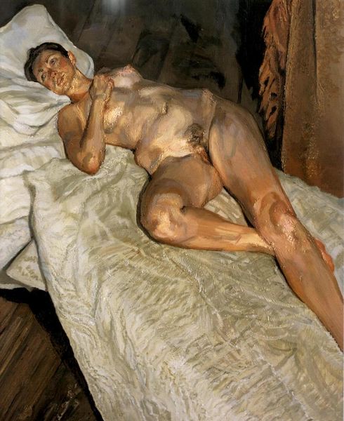 Editor: This is Lucian Freud’s "Naked Solicitor," painted in 2003. It's an oil on canvas. The texture looks thick and heavy. I'm struck by the model’s gaze, direct and almost challenging. How do you interpret this work within the broader context of portraiture? Curator: It's vital to view Freud's portraits, like this one, as products of their time. He challenges conventional representations, rejecting idealization. What’s compelling is how the ‘naked’ in the title goes beyond physical nudity to a kind of raw psychological exposure. Do you see any link to the societal norms regarding representation in British art, particularly at the turn of the 21st century? Editor: It's definitely pushing against the traditional, idealized nude, almost reclaiming it for a more honest depiction of the body. But I’m wondering about the power dynamic here. How does Freud, as the artist, wield power over the subject through the act of painting? Curator: Exactly. The "Solicitor" becomes a spectacle, stripped bare – both literally and figuratively – for the viewer's consumption. The question of power dynamics is paramount, especially when considering Freud's reputation and the history of the nude in art. His style, rooted in the School of London, highlights a certain brutal honesty. How does this ‘honesty’ play into our contemporary discussions surrounding body image and representation in the art world? Editor: It's interesting to think about it in that context. It’s provocative to consider whether this kind of realism is inherently exploitative, or if it can be a step towards a more inclusive and unfiltered view of the human form. Curator: Precisely. Freud certainly provokes a dialogue around the public role of art and how we grapple with the politics of imagery. It challenges our preconceptions and raises important questions about the ethics of representation. Editor: This has definitely given me a lot to think about regarding how societal context affects art and portraiture. Curator: Indeed. This work demonstrates how art operates within – and often against – the prevailing currents of social and artistic convention.