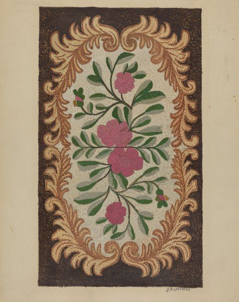 Editor: Here we have Martin Partyka's "Hand Painted Wall (Detail)," a watercolor drawing from around 1939. It’s a beautifully muted composition; a central floral arrangement framed by architectural flourishes. There’s a fragility and grace in the line work that strikes me. How do you interpret this work, especially considering its historical context? Curator: That’s a great starting point. Think about where this drawing may have existed - and why. Given its style and the date, this work might reflect the popular interest in folk art traditions or regional crafts promoted during the New Deal era. Artists were often employed to document and revitalize traditional art forms. Could this be a study or record of painted decorations found in homes, perhaps of Polish immigrants, given the artist's name? What can the decorative floral and architectural elements suggest to us? Editor: That makes sense. The New Deal emphasis on celebrating American identities... maybe it's a record of a fading cultural practice? The flowers could represent hope or remembrance. And the classical framing motif adds a sense of history. But the colours seem subdued for celebratory art; does that connect with the artist documenting it at the end of it's cultural importance? Curator: Exactly. The muted tones could indicate something beyond simple celebration - think about the social and economic conditions during that time. The Dust Bowl, the looming war in Europe. It's as though Partyka preserved it right as a vibrant cultural expression started to decline in usage. Is he trying to portray the slow decaying effect of new construction, perhaps to a traditional building? What kind of audience would it have, and in what medium should he create the work, if the message had to reach them most effectively? Editor: That really enriches my understanding. So, this artwork is more than just a pretty decoration, but a historical document laden with socio-political implications. Thank you, I appreciate you opening my eyes to the narrative beyond the visual charm. Curator: And thank you for drawing us in with that 'visual charm'!