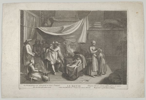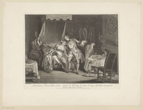 Louis Surugue created this etching, "Slaapkamerinterieur met man die een kamerpot van Ragotins voet haalt," during the 18th century. At first glance, the scene is domestic—a bedroom, a man, a chamber pot—yet the composition brims with shared human experience. Note how the chamber pot has taken on a life of its own. This is a mundane object, yet here, it's a symbol of an intimate crisis. This connects to the ancient Greek depictions of Dionysus, the god of fertility and wine, often shown with symbols of earthly pleasures. Like the Bacchic frenzy, our chamber pot embodies an earthy, base human drama. There is a collective emotional release, a shared moment of both humor and distress. This reflects a communal aspect of human life, a recognition of our shared vulnerabilities, much like the medieval carnivals where social hierarchies were turned upside down to deal with societal tensions. The etching invites us to reflect on the cycles of life, where humor and discomfort intertwine, engaging our subconscious understanding of shared human experiences.