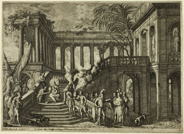 Editor: Here we have Pierre Moreau’s print, "Funeral Scene in Imaginary Architecture," made using engraving techniques. The scene has a definite solemn mood, enhanced by the contrast between the intricate architectural elements and the somber procession. What stories do you think this piece might be telling? Curator: Well, first note how the architecture itself—these grandiose, almost theatrical arches and columns—functions as a stage for human drama. Observe the figures carrying the deceased. They become part of a carefully constructed narrative. Do you notice how the linear perspective directs our eyes, not just into the pictorial space, but towards an idea of the eternal, signified by that classical architecture? Editor: I do see that. It's interesting that the figures seem relatively small in comparison to the overwhelming size of the building. Curator: Exactly! Consider the inscription 'D.O.M.' visible on the plinth to the left: *Deo Optimo Maximo*, dedicating the scene to God, the greatest and best. It speaks to a cultural memory, connecting earthly mortality with a desire for heavenly transcendence. Notice also how Moreau, although presenting an imagined scene, relies on the visual language of real Roman monuments. How does that inform your understanding? Editor: So, it’s like he's tapping into this collective understanding of history and grandeur to elevate the funeral scene? It really connects to this sense of cultural continuity... Curator: Precisely. The image becomes a site where the viewer contemplates not just death, but also the enduring power of cultural symbols across time. What remains with you after encountering such an image? Editor: Definitely the blend of personal sorrow within this massive, historical, almost timeless framework. It’s something to ponder. Curator: Indeed. These visual echoes allow us to perceive our own experiences as part of something much larger.