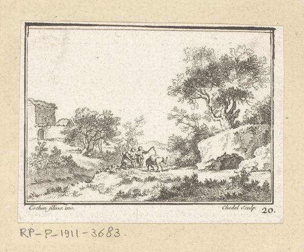 Editor: This is "Landscape with a Ruin on the Right," created between 1725 and 1763 by Quentin Pierre Chedel, an engraving currently held at the Rijksmuseum. It strikes me as melancholic, the ruined structure hinting at a lost grandeur, now reclaimed by nature. How do you interpret this work? Curator: What interests me most is Chedel’s process. Think about the labor involved in producing this image. The metal plate itself, the tools, the precise hand movements required for each line… it all speaks to a complex system of production and consumption in 18th-century Europe. Consider the engraver's role – not just as an artist, but as a skilled worker embedded in a particular socio-economic context. What materials were available? Who commissioned the work? Where was it intended to be sold and circulated? Editor: So, rather than focusing on the aesthetic beauty of the ruin, you're drawn to the more practical aspects of its creation? I hadn't really considered that angle. Curator: Exactly. The "beauty" itself is a product of labor, of available materials, and of specific economic structures. The image reproduces and thus perpetuates power structures. Think about the relationship between landscape art and land ownership, or the emerging print market's impact on the dissemination of ideas. These landscapes romanticize an era built by exploitation. Is there a tension between the romanticism of the ruin and the harsh realities of the society that produced both the ruin and the print itself? Editor: That's fascinating! It definitely changes my perspective. I was focused on the emotional impact of the image, but now I see how much the materials and context contribute to its meaning. Curator: Precisely! The artwork is not an isolated object, but a nexus of social and economic forces. Editor: Thank you. I learned how material conditions inform artistic expression, going beyond immediate impressions. Curator: And I got to reiterate the significance of considering labor and production, which are all-too-often absent when looking at works of art.