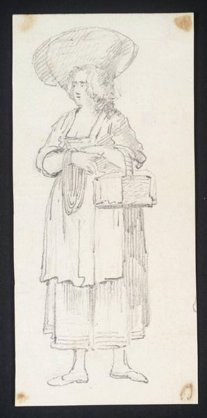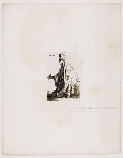 Curator: Here we have "Parisian Types" by Louis Alphonse Gérard. It's a quirky character study. Editor: My first thought? A little… judgmental. Like a medieval gossip eager to share the latest scandal. Curator: Perhaps! The artist captures a certain attitude with those etched lines. Notice the almost comical, pointed nose and the way the robe falls. Editor: It’s the minimalist style that really strikes me. Just enough detail to convey a story. Curator: A very specific story, wouldn't you say? Each line seems so deliberate, like a whispered secret. Editor: Absolutely. And the open hand—is it offering something, or merely pointing blame? Curator: Exactly! Ambiguity is key here. Editor: It seems that Gérard has created an enigmatic figure that can be interpreted endlessly. Curator: It’s a wonderfully intriguing character. Editor: One I'd probably avoid on the streets of Paris.