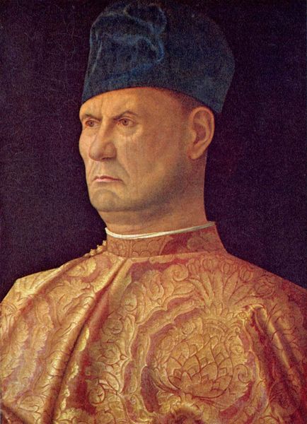 Giovanni Bellini painted this portrait of Doge Leonardo Loredan in oil, a medium that allows a remarkable rendering of surfaces and textures. The composition is strikingly simple: the subject is set against an unmodulated blue background that pushes him to the foreground. It throws focus onto Loredan's face and his elaborate garments. Notice how the patterning on Loredan's robe is so detailed that it almost assumes a life of its own, creating a complex interplay between surface and depth. The details of the Doge's garments also contrast with the serene and composed expression on his face. This duality captures the intersection of individual identity and institutional role, echoing the complex social structures of Renaissance Venice. Finally, consider how Bellini’s use of line and color serves to elevate the portrait beyond simple likeness, acting as a cultural and philosophical marker. The portrait challenges how we perceive power and representation.