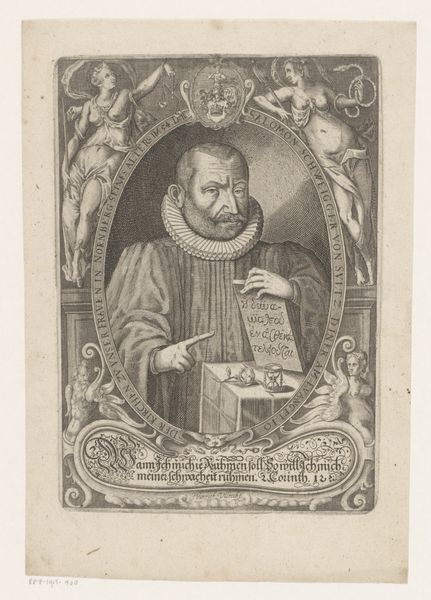 Editor: So, this is an engraving of Sebastian Gottfried Starck. The information says it's dated sometime between 1665 and 1721. It’s striking how much detail is packed into the frame around his portrait. What jumps out at you in this piece? Curator: This engraving presents us with a rich tapestry of symbols. Notice how the central portrait of Starck is framed not merely decoratively, but didactically. The surrounding imagery acts as a visual biography, less concerned with realistic likeness and more intent on conveying his essence. Editor: A visual biography, that’s interesting! Can you expand on that? What essence are we talking about? Curator: The image motifs provide insight. We see scenes referencing biblical stories, intertwined with what seem to be allegorical representations of his life’s work as pastor and superintendent. For instance, observe the images along the top edge. Can you see how the landscapes evoke ideas of spiritual seeking and enlightenment? Editor: I see what looks like a figure kneeling in prayer, almost like a pilgrimage. It's balanced by some writing in latin: 'Anima sitiens'. Would it be right to say this suggests longing of the soul? Curator: Precisely. That symbol anchors this engraving and offers an intimate view of Starck’s life, thoughts, and devotion. Then notice the pillars, cherubs, and scenes from his life incorporated throughout – what impression do those create? Editor: They almost feel like milestones or trials and virtues, highlighting accomplishments within his religious path? It seems like he wants the world to remember and honour his legacy. Curator: It's a compelling visual statement, indeed! Cultural memory carefully curated through symbolic language. Editor: It gives me a whole new appreciation for these kinds of historical portraits! Thanks!