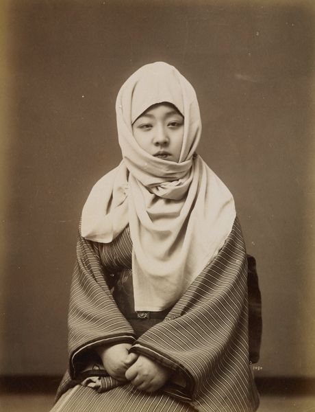 Editor: This is "Fille de Sootchow" or "Suzhou Girl," a photograph from the 1870s by Raimund von Stillfried. It’s at the Met in New York. What strikes me is the contrast – the oval framing against the subject’s modern clothes, and her rather piercing stare. What do you see in this piece? Curator: I see layers of visual symbolism and the complexities of cultural exchange. Look at the fan she holds, the placement of her hands, the elaborate hair ornament, they whisper stories about status, beauty ideals, and even perhaps, constraint. Editor: Constraint? How so? Curator: Consider the pose itself. The direct gaze seems at odds with what we know about societal expectations of women during that era. And the ornamental dress is both beautiful and yet it’s designed to express conformity. Do you see how Stillfried uses these established conventions and adds his own perspective? Editor: So you’re saying it’s a visual dialogue between the artist, the sitter, and the viewer? Curator: Exactly. And, moreover, this photograph acts as a kind of cultural mirror, reflecting the Western gaze on the ‘Orient.’ The artist is documenting something but also constructing a vision, perhaps shaped by preconceived notions. What does this juxtaposition suggest to you? Editor: I think I'm understanding more now about how to interpret these older images by really looking at them in their full cultural context. The artist captured a moment, yes, but through a complicated lens. Curator: Indeed. Images aren't passive records. They're alive with encoded meaning. It’s crucial to unpack what they mean when you study the past.