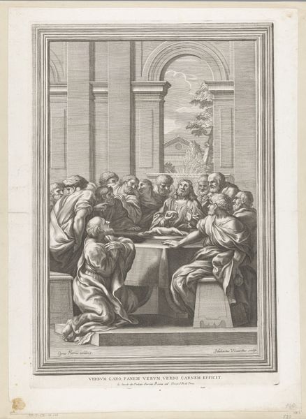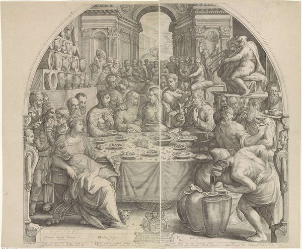 Editor: Here we have Domenico Campagnola's "Herod's Banquet," a drawing from sometime between 1500 and 1564. The figures, rendered in ink, feel very theatrical, almost staged. What can you tell us about it? Curator: Well, consider the architectural setting. Note the use of columns, reminiscent of Roman triumphal arches. It suggests not just a feast, but the proclamation of power, doesn’t it? The visual language merges earthly authority with a sense of timeless, even divine, right. The plate carried forward… what do you think is on it? Editor: Hmm... It's hard to make out for sure, but I think I see hair... Is that John the Baptist's head? Curator: Exactly. The symbol of John’s head becomes central. Think about what the head represents in art history - the seat of intellect, identity, and in this case, martyrdom. How does the artist juxtapose the horror of that symbol with the festivity of the banquet? Editor: It's like he’s showing the banality of evil, where something so gruesome is just part of the spectacle for these people. I see that a few guests averting their eyes, so some of them recognize the gravity of what has happened? Curator: Perhaps, or it might be to point toward their collusion to Herod's deeds and their passive agreement. That avoidance reinforces how cultural memory functions – what is seen, what is actively ignored, and how symbols evolve to carry meaning across generations. Notice the figure lower left who’s averted his gaze downward away from John. Editor: I do now. That is pretty chilling when put into perspective! I guess these images continue to hold power because of these layers of meaning that reflect persistent aspects of human nature. Curator: Indeed. Visuals crystallize cultural narratives, provoking continuous examination, debate, and personal awareness through changing contexts.