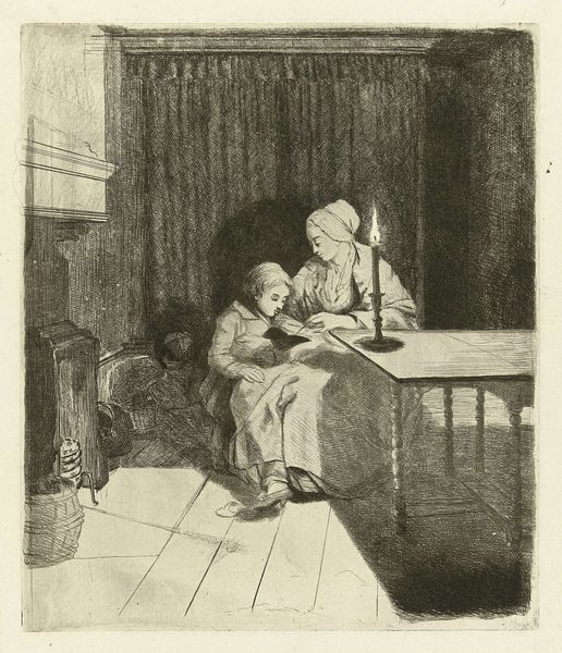Editor: This drawing by Louis Bernard Coclers, "Moeder geeft haar zoon les," made sometime between 1756 and 1817, really captures a quiet, domestic scene using just pencil. I'm struck by how ordinary and relatable it feels, like a snapshot of daily life. What do you see in it? Curator: What immediately jumps out at me is how this drawing intersects with ideas about education and the family within the late 18th century social context. Note how Coclers presents the mother as the instructor, a role often marginalized historically. This reflects a shift in thinking, particularly among the bourgeoisie, emphasizing domesticity and the moral instruction of children, often spearheaded by women within the household. Do you think this challenges existing social hierarchies? Editor: I hadn’t thought about it like that! It is interesting to see the mother as the teacher. So, instead of just being a domestic scene, it could be subtly promoting female intellectual capability? Curator: Precisely! The distribution of imagery also played a vital role. Drawings like this could have circulated within a specific social stratum. The presence of realism, shying away from idealization, further grounds it in a particular sociopolitical sphere that values everyday life and relatable figures. Also consider where art like this might be displayed and who would be able to access the original. Editor: That’s fascinating! Thinking about how and where art circulates really changes how I see it. I appreciate learning about art through the lens of social history. Curator: And I appreciate your insights! It reminds us to always consider the many layers that contribute to the artwork's narrative. Art acts as a mirror reflecting society's changing values and norms.
