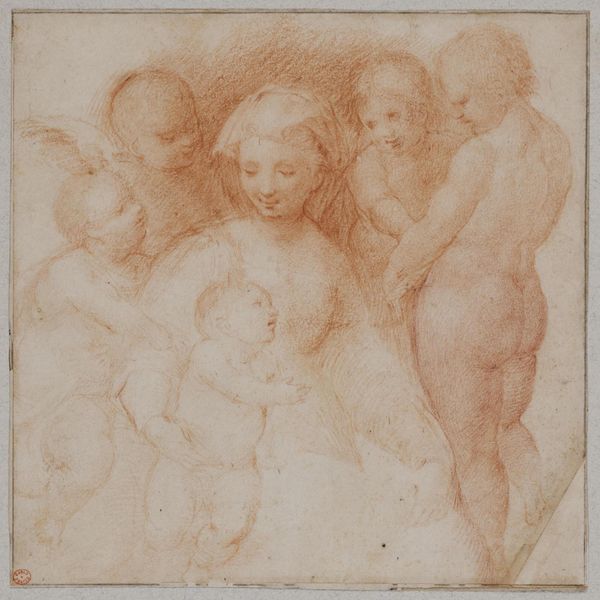 Curator: Right, let's dive in. Here we have "Woman with Several Children," a drawing rendered in pencil, dating somewhere between 1653 and 1706. It’s currently held here at the Rijksmuseum, and the piece is by Godfried Schalcken. Editor: What strikes me immediately is this feeling of intimate chaos, you know? It's not posed; it feels like a stolen moment of real-life domesticity. The lines are so fluid. It almost feels like a living snapshot. Curator: Indeed. Schalcken has masterfully used the baroque style here, a movement that often captures dynamism and intense emotion, evident in the spiraling composition and the subjects' expressions. Notice how he arranges the figures, creating this bustling energy that almost bursts off the page, yet remains anchored. Editor: That red chalk, sanguine, really warms the scene. The subtle shading lends depth and gives almost three-dimensional substance to those pudgy little cherubs! There’s also the classical figure she reminds me of: draped fabrics and this knowing look away. What are those other allusions do you think, if any? Curator: Interesting. She could be allegorical, a depiction of Charity. Representations of this virtue often feature a woman surrounded by children needing care. It's fascinating how he plays with expectations though, doesn't it? He places the classical idea inside a candid, believable moment. Editor: Precisely! And, speaking to a formal tension, there is so much happening in the center, and the figure on the far right seems almost faded, or like it has a delayed relevance within the drawing. As if its appearance were contingent on other parts resolving, becoming completed or activated first. A sort of semiotic unfolding across the work... Curator: I never quite saw it like that, though now it’s difficult to unsee it. What do you think this work suggests about how Schalcken viewed women, home life, and art in the broader cultural imagination of the Dutch Golden Age? Editor: I suppose that I take it as Schalcken appreciating the strength and vigor inherent in domestic life, seeing its dynamism. How radical, right? The art world wasn’t always the space that it is now. Curator: Definitely something to chew on next time I pass this one by. Editor: Absolutely, it's like glimpsing something sacred through a keyhole—the messy, glorious beauty of everyday love and labor!