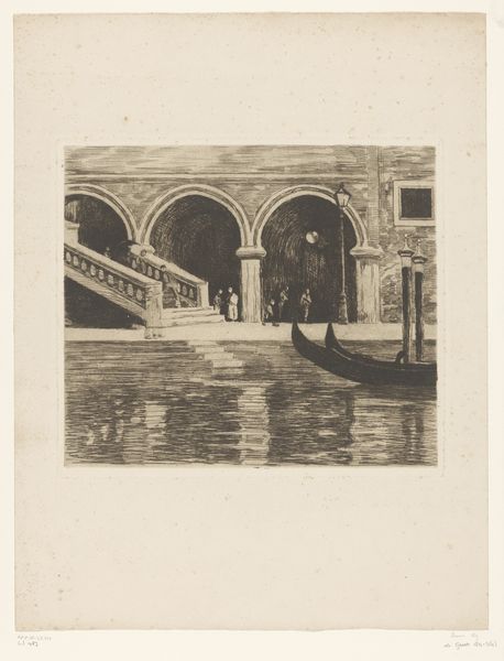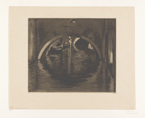 Willem Witsen made this artwork, titled "Gezicht onder een boogbrug te Venetië," or "View under an arched bridge in Venice," with watercolor on paper. Notice how the composition is structured around a strong horizontal axis created by the water, bisected by the dark, imposing arch of the bridge. The limited palette of greys and browns fosters a somber mood, while the reflections in the water create a subtle play of light and shadow. This use of muted colors and watery reflections could reflect the influence of Japonisme on Western art, echoing the flat planes and atmospheric perspective often found in Japanese prints. The bridge, a powerful architectural form, frames a glimpse of the Venetian canal, inviting us to consider the relationship between the city's constructed environment and its natural waterways. The architectural elements are rendered with a focus on their structural form, emphasizing their role in defining and shaping the urban space. In the broader context of late 19th-century art, Witsen's interest in capturing the quiet, contemplative aspects of urban life reflects a shift away from grand historical narratives toward more intimate and personal observations.