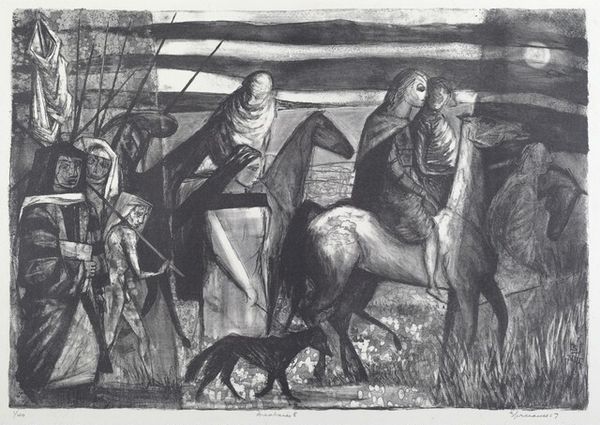 Curator: Right, let's talk about "Domestic Life - 3800 Level - Empire Mine," a 1935 graphite and pencil print by Ray Boynton. Editor: Woah, instantly, I'm getting such a heavy mood. Everything’s draped in shadow, and there’s this mule, standing so still…almost ghostly, don’t you think? Curator: The image certainly possesses a somber tone. The scene captures an interior of a mine, possibly a stable or holding area, complete with a mule, equipment, and even a cat dozing in the lower corner. Editor: A cat! Missed that the first time, a small comfort amidst all the bleakness. Still, it’s that mule that gets me. It looks exhausted, resigned maybe? All the crisscrossing lines in the pencil work feel like…bars. Curator: Mules served as indispensable components of the mining operations, and the cat hints at some sort of attempt at creating a homelike setting, perhaps hinting at warmth within harsh, almost inhumane labor. The presence of the cat introduces an icon of comfort, resilience and ordinary life into the dark, subterranean realm. Editor: So you’re saying it’s not just about depicting a place but evoking a feeling about the life *in* that place. Even the title is a bit sarcastic – "Domestic Life" at the 3800-foot level of a mine? I mean, what a juxtaposition. Curator: Exactly! Boynton captures the spirit of the time. The realism feels stark. Notice how light plays—or rather, struggles—across every surface. It creates a sense of depth, making the mine feel even more vast and echoing. Editor: It makes me wonder what Boynton intended to say with it. Was he romanticizing the miner's life or perhaps throwing shade at it? It's oddly affecting, like looking at a memory half-forgotten. Curator: That ambiguity adds to the work’s complexity. Perhaps Boynton aimed to provoke reflection on how industry encroaches into life. Editor: Definitely food for thought, as bleak as it seems. Curator: Yes, a simple image but one full of historical and emotional complexity.