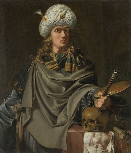 Editor: Here we have Jan Miense Molenaer's "Self-portrait" from 1640, rendered in oil on canvas. I find myself drawn to the almost theatrical presentation. What strikes you most about this piece? Curator: Immediately, I’m compelled by how Molenaer presents the very act of artistic production and its cultural position. The overt display of a skull, the book, even his opulent clothing... they are not merely symbols, but signifiers of material wealth, labor, and intellectual capital within the Dutch Golden Age art market. He isn’t simply portraying himself; he's displaying a constructed persona designed for consumption. How do you perceive the role of "vanitas" elements here? Editor: I see the skull as a traditional reminder of mortality. Are you suggesting there's more to it than just that? Curator: Exactly! The skull isn't merely about death; it is about its commodification within painting itself, an almost self-aware acknowledgement of art's power to grapple with philosophical concepts as desirable, sellable objects. The materials – the costly pigments, the canvas itself – required resources and specialized labor. Editor: That's a fascinating angle! It almost feels like he's winking at the viewer, acknowledging the transaction. So, would you say the very medium becomes the message in this context? Curator: Precisely. It reveals a dialogue between artist, patron, and the market— the economic machinery driving art’s creation, purpose, and, frankly, its social life. He uses conventions, but complicates them through a consciousness about how his materials become intertwined with cultural significance and value. Editor: I hadn’t thought of it that way before, focusing on how it shows not just the subject, but also the system surrounding its creation. Thanks, that offers so much more insight. Curator: Gladly. Looking closer always unveils complex truths about cultural labor, and that's something art relentlessly delivers.