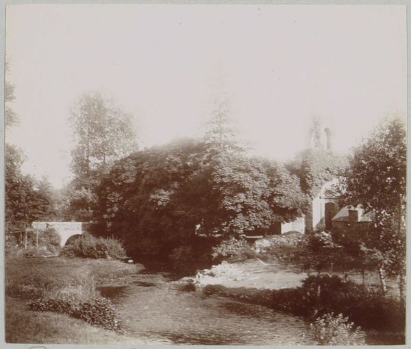 Curator: It’s an eerie image, don’t you think? Editor: Absolutely! Overgrown, melancholy. Like a secret garden someone forgot existed. Curator: Indeed. Here we have a 1903 photograph, attributed to Delizy, titled "Overgroeid gebouw aan een binnenplaats," which translates to "Overgrown building in a courtyard," likely part of a French country house or castle. It resides in the Rijksmuseum collection. Editor: The way the vines are consuming the architecture gives it a certain…poetic sadness. The light feels trapped, almost. Did you notice those stools and equipment over to the side? Curator: An interesting observation! Considering that Delizy practiced photography as a fine art, often documenting scenes in France, these photographic elements on the right might represent her conscious involvement, a record of that past era—perhaps a statement on nature's power to reclaim spaces altered by humans? Editor: Yes, reclaiming. Beautifully said. I’m struck by how little the human form intrudes on the image. It makes you wonder what narratives this lost place could tell us about class and labor. Curator: Well, country houses were potent symbols of landed gentry and socio-economic class, so in that sense Delizy's photo evokes some discussion of the relations among the powerful, the working classes and nature itself, with this near-derelict castle overcome by mother nature's sublime beauty. I imagine such a narrative challenges traditional conceptions of status or wealth. Editor: Definitely. It has echoes of gothic romanticism as well. All this makes me want to wander those forgotten places! I have no problem with these old institutions gradually dissolving back into wildness... it brings new life! Curator: A fitting perspective, and now I must confess this image leads me to think that history isn't static or set in stone but fluid; old edifices are destined to fall to ruin, be changed by those occupying its former rooms, etc. Editor: Nicely put! I really enjoyed revisiting that hidden gem today.