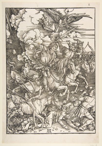 Christoffel van Sichem II created this woodcut print of the Four Horsemen of the Apocalypse in the 17th century. The print depicts figures from the Book of Revelation, harbingers of the end times, each carrying potent symbols. The horsemen of conquest, war, famine, and death, ride forth bringing chaos to humanity. Conquest carries a bow, war brandishes a sword, famine holds scales, and death is accompanied by a ravenous beast. The figures enact a collective, primal fear of inevitable destruction. This fear is not unique to Christian eschatology. The motif of impending doom resurfaces in various forms throughout history, from ancient myths to modern anxieties. The enduring presence of such images reveals a deep-seated, cyclical pattern in the human psyche. It's a powerful, subconscious acknowledgment of mortality that transcends time.