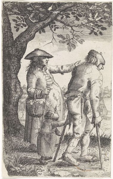 Adriaen van Ostade created this print, "Man with a pleated collar with a peasant couple," using etching techniques. The composition reveals a striking contrast in stature and attire that invites a closer look. Notice how the figures are arranged: the imposing man with the elaborate collar dominates the foreground, while the peasant couple is slightly behind. This positioning isn't just about placement; it's a visual cue about social hierarchy. The etcher’s fine lines capture the texture of fabrics, the weight of the cloak, and the rough appearance of the peasant's garments, all rendered in subtle gradations of tone. Ostade uses line and form to destabilize simple categorization. Are we to see in the contrast a critique, a celebration, or a detached observation of Dutch society? The tension between the figures leaves us questioning the very structure of representation and the codes by which we interpret social roles. This tension reflects the broader philosophical inquiries into representation and societal structure.