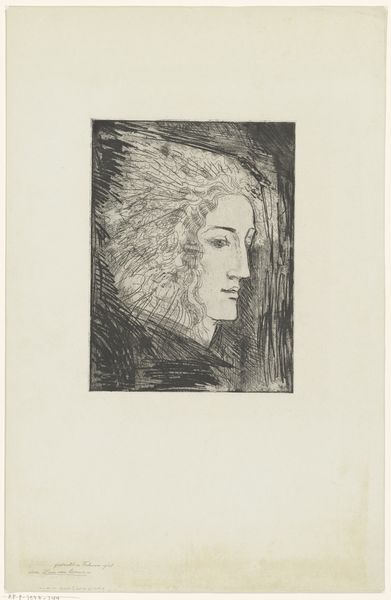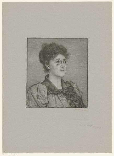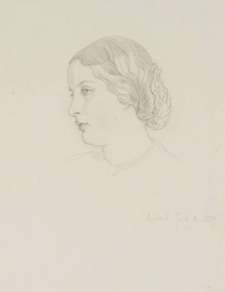 Editor: Here we have Jan Veth’s "Portret van Hélène Swarth," created in 1892. It’s a delicate pencil drawing on paper, currently housed in the Rijksmuseum. What immediately strikes me is the artist’s focus on line and form – the soft curves of her hair versus the sharper angle of her nose. It’s so minimal, yet so expressive. What do you see in this piece? Curator: Indeed, the expressive quality emerges from a meticulous arrangement of forms and values. The composition is strategically divided into a central rectangular block isolating the model and contrasting the empty space, heightening the subject's introspective aura. Note the contrast between the soft, almost ethereal rendering of her hair, achieved through delicate gradations of pencil strokes, against the firmer, more defined lines articulating her facial features. It is this interplay that establishes a visual hierarchy, guiding the eye across the composition. Editor: I notice the dress appears unfinished. Is this intentional? Curator: Precisely! The calculated incompleteness shifts the focus away from superficial details, and back toward the line as defining form itself. Notice also how the light doesn't seem to originate from one specific source; rather, the artist utilizes tone to define structure. It transcends mere representation, instead examining the interplay of texture and mark-making itself. What philosophical conclusions can we draw, knowing the author privileges an intellectual rendering, against the background of the incomplete form? Editor: It really forces you to consider the elements the artist chose to emphasize. This makes me think differently about portraits and their ability to convey ideas beyond simple likeness. Curator: And, furthermore, we are able to investigate what parts of likeness are important or inessential to us through a structured approach of breaking it down. Now, perhaps you have a taste for the kind of depth that formalism can provide when analyzing art?