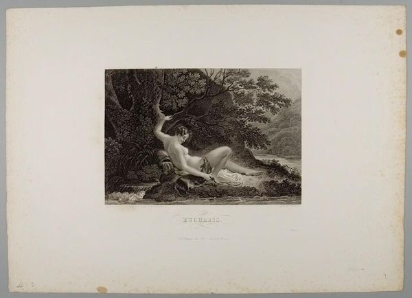 Curator: Let's discuss Jean Prud'hon's "Leda," housed here at the Harvard Art Museums. It captures a very classical scene. Editor: Oh, this is intense! All the shadows, the dense foliage—it feels like a fever dream. So dramatic! Curator: Prud'hon, who was born in 1778, would have likely used a technique like stippling, carefully building up the image with tiny dots. It speaks to a pre-industrial mode of production. Editor: The swan looks awfully pleased with itself, doesn't it? And Leda's pose – is she resisting, inviting, or just plain confused? Curator: These depictions of Leda were often commissioned by wealthy patrons, reinforcing power dynamics and idealized beauty standards. Editor: It's a bit unsettling now, seeing this classical myth filtered through a lens of privilege and control. I like that it still makes me question things. Curator: It’s a good reminder to examine the historical context and production behind even the most seemingly timeless images. Editor: Absolutely. It turns the dream into something a bit more real, and a bit more complicated.