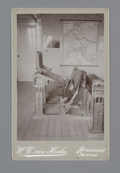Editor: Here we have Willem Cornelis van Hoeke's photograph, "Klaslokaal met schoolbanken, geografische wandkaart en ketels," dating from around 1892 to 1917. It’s a gelatin-silver print of a classroom. I'm struck by the austerity of the room – the hard lines of the desks and benches. What’s your take on this piece? Curator: What intrigues me is the labor embedded in every object here. Think of the wood: felled, sawn, planed, joined, polished. Consider also the social context, with each item shaped by societal attitudes towards education and its industrial underpinnings. And those meticulously placed kettles? They hint at basic sanitation standards – another manifestation of labor. What kind of labor produced these objects? Were they made in a factory? Editor: That's a really interesting perspective I hadn’t considered. I was focusing on it being almost bleak. Do you think that focus on production also shifts our understanding of realism as an artistic style? Curator: Absolutely. Realism often obscures the means of its own making. The artist, in choosing to photograph this classroom, makes an argument for visibility. Who benefits from this portrayal? The act of documenting such spaces normalizes particular ideologies and modes of production within a quickly transforming industrial society. Think of it this way: Photography's widespread adoption hinged on the labor and availability of its constituent materials—glass, silver, chemicals. Does understanding those relationships change your view? Editor: Yes, definitely! Focusing on the materials and labor makes me realize how much more there is to this seemingly simple image. I had not considered how realism relies on complex social and economic structures! Curator: Exactly! By interrogating materials and production, we challenge established boundaries between what constitutes "high art" versus mundane craft, revealing networks of relations behind objects and images we typically take for granted.