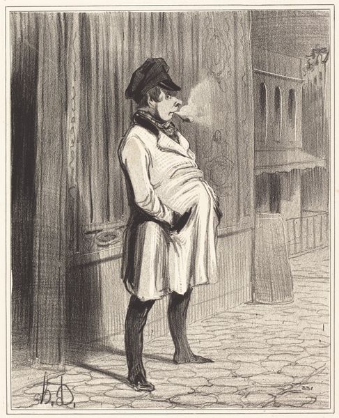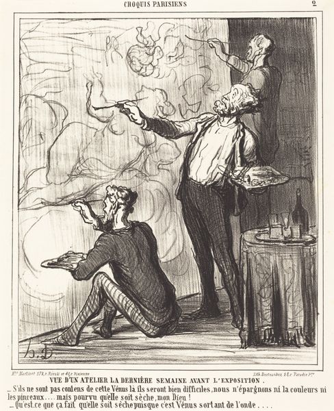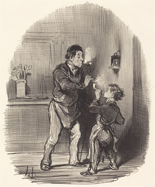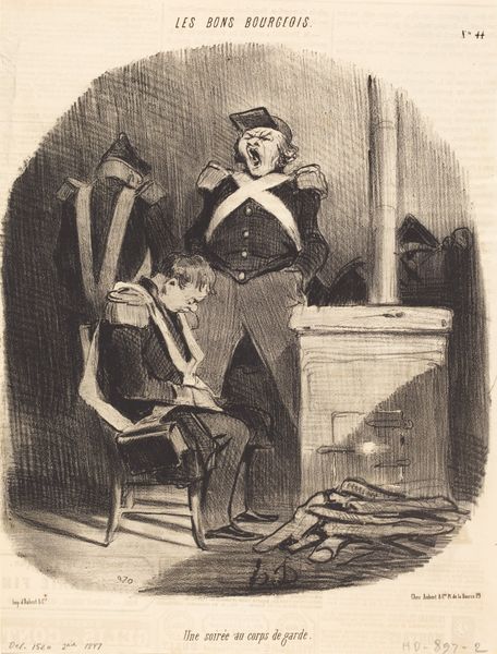 Editor: So, this is Honoré Daumier's lithograph, "Les Suites d'une insurrection," from 1849. It shows a rather dismal scene. A child in a dunce cap kneels before an authority figure. The kids behind them look bored. It definitely strikes a tone of disillusionment. How do you interpret this work in light of its historical context? Curator: Disillusionment is spot on. Daumier created this during a period of intense political upheaval in France. This lithograph speaks volumes about the failed promises of the 1848 Revolution. It suggests a critique of power and authority through what appears at first glance as a simple classroom scene. Think about who that figure with arms crossed is meant to represent. Editor: Someone in charge? Perhaps a representation of the ruling class? Curator: Precisely! The ‘insurrection’ has consequences, visible here as public shaming. Daumier often used caricature to expose the hypocrisy and brutality of the powerful. How does knowing it is a lithograph, a print, and therefore widely reproducible, change our understanding? Editor: Well, prints are often about social critique and activism because they're accessible and get the message out. The act of mass distribution becomes a statement itself! Daumier is spreading dissent. Curator: Exactly. This artwork wasn't just seen; it was disseminated widely, becoming a crucial visual commentary during that period. It speaks directly to the power of imagery to shape public opinion. I find it's power endures as we confront inequality today. Editor: I had no idea it was so pointedly political. Curator: It’s easy to read it as just a harsh teacher and student. The social context transforms it. Editor: Right. This work is about institutional critique, mass communication, and the way art engages with political power. Curator: Absolutely. Art becomes a record and agent of social change. It can bring new perspective when facing inequality or public dissent.