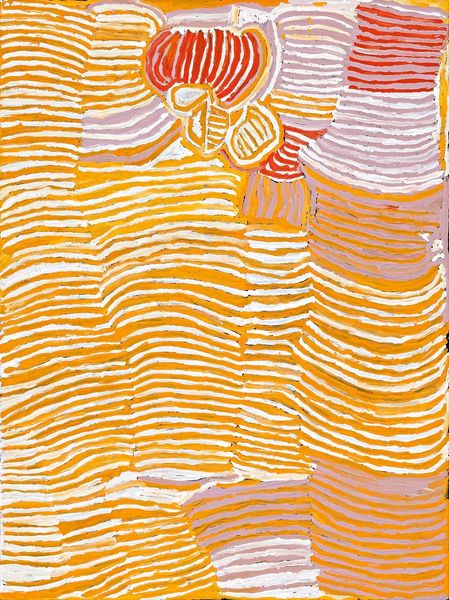 Editor: We're looking at an *Untitled* piece by Makinti Napanangka from 2003, rendered in acrylic. It strikes me as an energetic visual field of patterns—almost a topographical map seen through a hazy sunset. What’s your initial reaction to this painting? Curator: Hazy sunset… I love that! To me, it's pure visual music. These lines, you see, are not just strokes of acrylic; they are rhythms echoing ancestral songs. Aboriginal art often transcends mere representation, becoming a vibrant manifestation of stories embedded within the land. See how the forms shift and pulsate, demanding our gaze and perhaps evoking the feeling of moving across vast landscapes? Editor: That’s interesting! So the repetitive lines and patterns are less about visual accuracy and more about… spiritual expression? Curator: Precisely! Though seemingly abstract, there's a profound connection to place. These designs might symbolize particular locations or dreamtime stories. But, you know, the beautiful enigma of abstraction also invites us to weave our narratives into its very fabric, to feel something deeply personal when faced with its energetic presence. What narratives spring to *your* mind? Editor: Hmm, I'm reminded of heatwaves shimmering on the horizon. Looking closely, I can almost *feel* the sun-baked earth. It’s amazing how such simple lines can create such a powerful sensation. Curator: Isn't it? This is a dance between the personal and the universal, between sight and soul. Ultimately, it is Makinti Napanangka's gift—making the ancient pulse with something utterly new. Editor: Absolutely. It’s certainly given me a new way to think about abstract art and its connections to culture and personal experience. Thanks!
