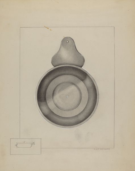 Curator: Charles Cullen's "Silver Porringer," crafted circa 1936, showcases the artist's meticulous approach through pencil on paper, exemplifying Realism. Editor: My initial impression is a sense of quiet dignity. It feels like an ode to domesticity and simplicity, almost melancholic. There is such detailed representation that I see vulnerability in this everyday object being rendered so carefully. Curator: It’s intriguing you pick up on the “melancholic,” as Realism often served social functions beyond pure aesthetics. Given the era, the Great Depression perhaps? Do you think the porringer itself speaks to social status? Editor: Absolutely, though not perhaps as obviously as, say, portraits of the wealthy. Silver hints at a certain aspiration or former privilege, especially if it’s meant for a child. Maybe even aspiration for things we think we should or must have. Does Cullen imbue a critique here or pay homage to domestic symbolism? What narratives exist when he captures it with such quietness? Curator: Those narratives become even more layered, thinking about artistic labor in that historical context. Drawing such detail, almost a technical study, in the Depression suggests an investment of time – whether that reflects personal means or WPA involvement comes to mind. Editor: Yes, the almost mechanical, exact reproduction also invites the narrative and socio-economic factors informing that, doesn’t it? It is interesting that he renders the item like an architectural rendering. The artist’s gaze, then, tells many stories. It begs questions about craft and aspiration for future promise. What do you make of that lens, considering class? Curator: The precision absolutely points to professional artistry, with ties to industry and design history perhaps? Its stark presentation, isolated on paper, detaches it from active social life. We are given pause to reconsider value, materiality. The porringer is suspended—an artifact, ready for analysis and contemplation. Editor: So true, in its stillness, Cullen opens questions far beyond domestic life and aesthetics—but of the socio-economic structures under which everyday people survive or even thrive. Curator: Right. In examining its place within broader systems, from art history to economics, hopefully our audience will pause to reflect too. Editor: I'm all for it; seeing objects this way enables people to confront critical concepts they might not think about every day.