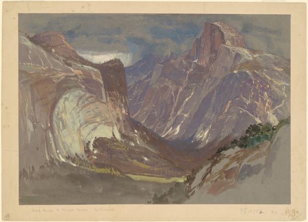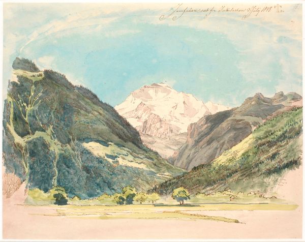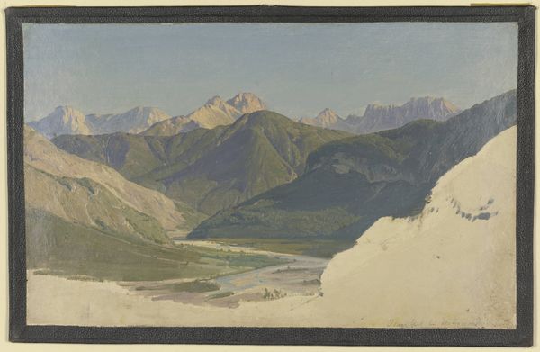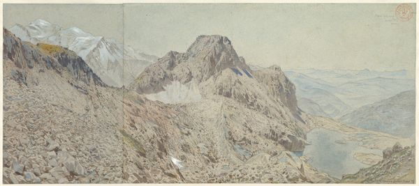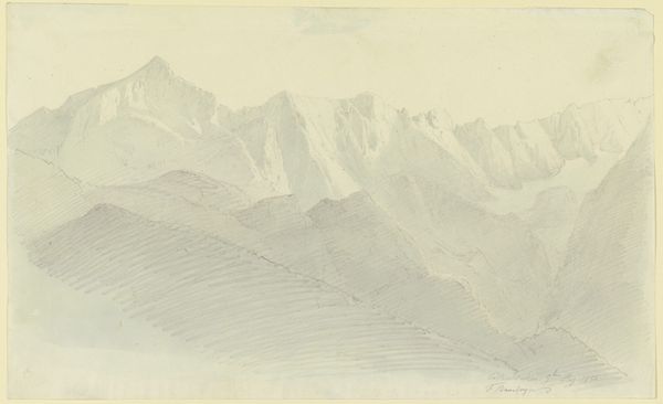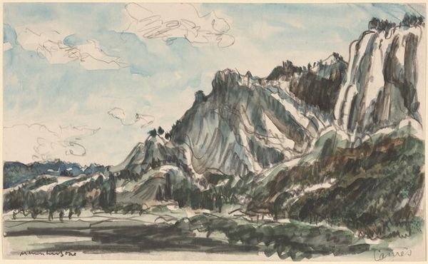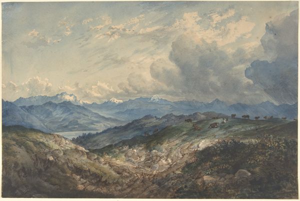 Johann Joachim Faber created "Civitella Seen from the North" using watercolor over graphite on paper. This landscape presents a study in contrasts, both in color and form. The composition is divided into two distinct areas: the cool blues and grays of the sky offset the warm browns and greens of the earth, creating a dynamic yet balanced tension. Faber employs loose brushstrokes to construct forms, such as the mountains and clouds, focusing on the interplay of light and shadow. This lends the scene a sense of atmospheric depth. The linear elements of the ridgeline and the receding valleys guide the eye into the landscape, while the textured application of watercolor evokes a tangible sense of place. Faber's use of perspective and tonal variation reflects the artistic interest in capturing natural phenomena with both accuracy and expressive freedom. The unfinished lower portion of the artwork emphasizes the artist's process, revealing the materiality of the paper and the evolution of the composition.
