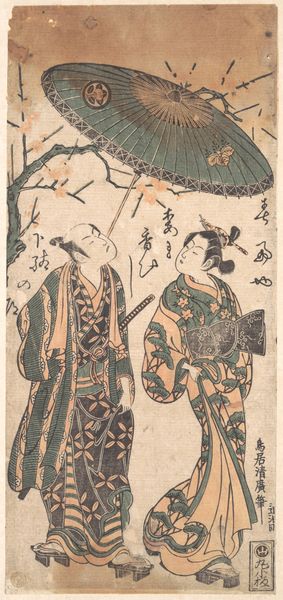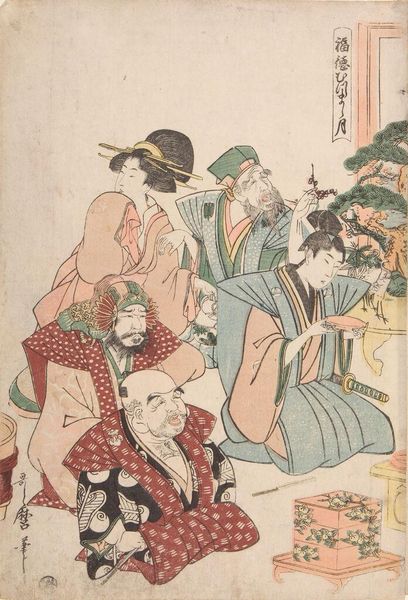 Curator: This is Torii Kiyonaga's "Children at Play," a paper print residing here at the Harvard Art Museums. What are your initial thoughts? Editor: The subdued palette and graceful lines evoke a sense of serene festivity. It’s a composition of understated elegance. Curator: The kites, the miniature shrine—these speak of rites of passage, celebrating children’s growth and future prosperity. Editor: Note the subtle interplay of geometric patterns in their kimonos versus the organic shapes of the bonsai. Such a beautiful tension! Curator: The shide streamers suggest purification rituals, warding off misfortune for the young ones depicted here. Editor: I see how these elements converge to create a captivating image, both simple and profound in its formal arrangement. Curator: The print reveals how cultural values permeate even playful scenes. Editor: Indeed, art and culture intertwine, reflected in the geometry of the print itself.