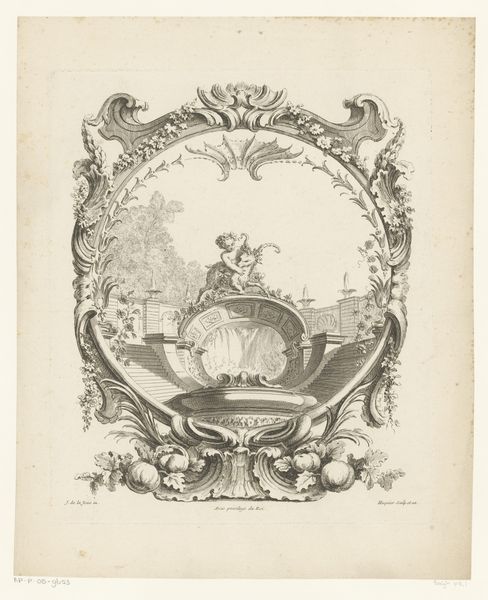 Gabriel Huquier created this print, "Saters met vaas," using engraving techniques. This method involves incising lines onto a metal plate, applying ink, and then transferring the image to paper, a process demanding skill and precision. Huquier's print exemplifies the era's fascination with intricate details. Look closely, and you’ll notice how the density and direction of engraved lines create a range of tones and textures, from the solid forms of the vase and frame to the ethereal quality of the landscape in the background. The arrangement of these lines is not just decorative; it’s structurally integral to the overall design, guiding your eye and creating a sense of depth. Prints such as this one played a vital role in disseminating artistic ideas and styles, making art accessible to a broader audience. They also served as a testament to the engraver's craft, blurring the lines between reproduction and original art. This piece reminds us of the labor and skill involved in translating images across different mediums.
