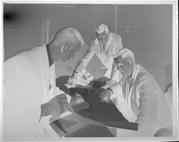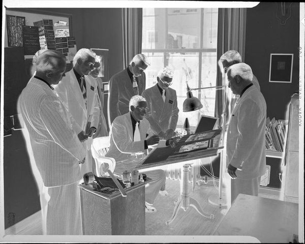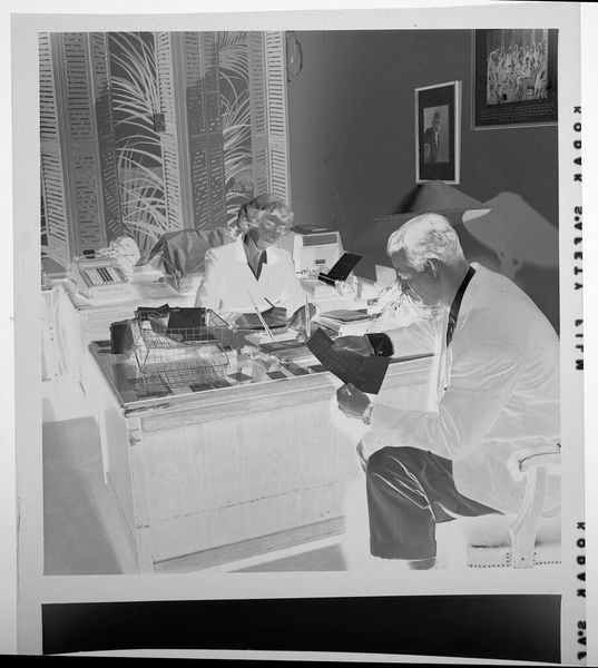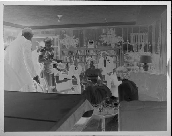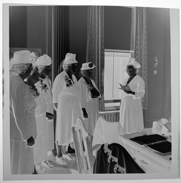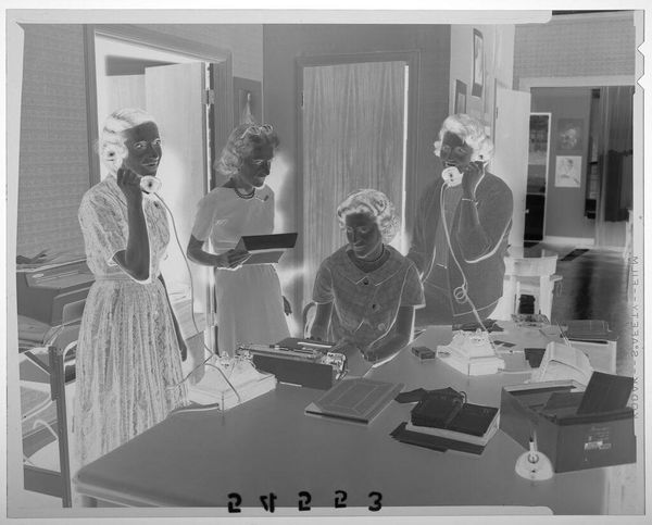 Curator: This photograph by Martin Schweig, currently held at the Harvard Art Museums, captures four women in an office setting. One is on the phone, surrounded by a typewriter and papers. Editor: The heavy, boxy technology really stands out. The textures and shapes of the machinery give the image a strong sense of material presence, almost industrial. Curator: Absolutely. The photograph likely depicts the shift in labor roles for women. The image documents their increasing presence in office environments, reflecting broader socio-economic changes. Editor: And what kind of labor? We see them interacting with this technology. The labor behind the typewriter and telephone feels very specific, bound to those tools. Curator: It raises questions about access to technology, the division of labor, and the evolving roles of women in shaping the modern workforce. Editor: It is a very straightforward photo, really. But even the absence of color adds to its texture. It feels like the past, in the present.