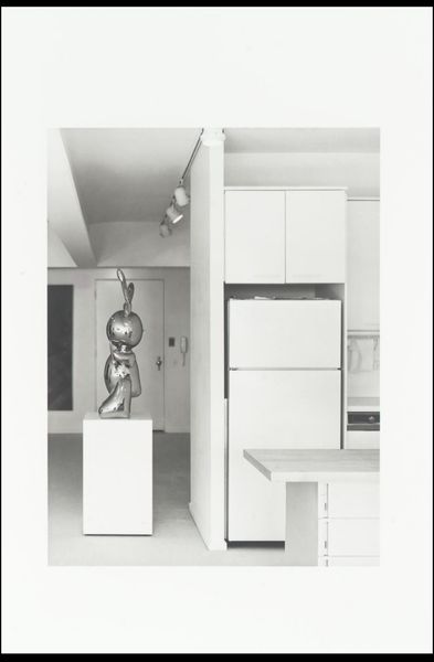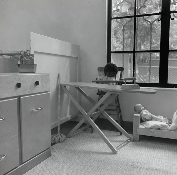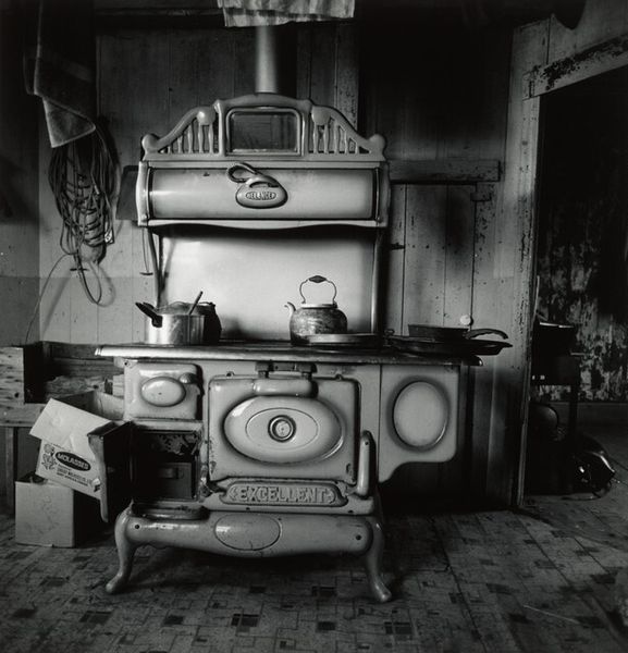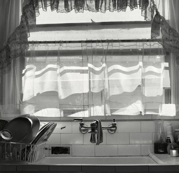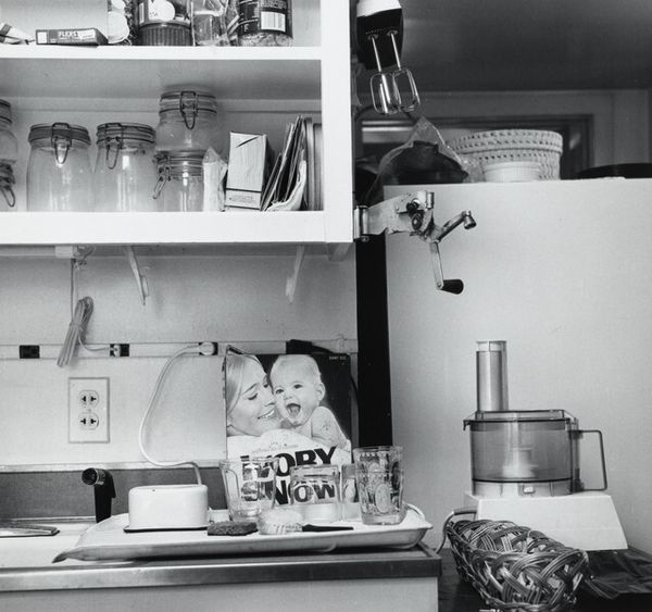 Joanne Leonard captured this photograph, "Kitchen, Joanne's Home, Blake Street, Berkeley, California," using traditional photographic materials and processes. The stark black and white tones emphasize the textures and forms of everyday objects, creating a detailed portrait of a domestic space. The focus on materials, from the smooth enamel of the stove to the rough weave of the basket, highlights their inherent qualities. The image documents mid-century domesticity, where the kitchen was the heart of the home. The tools and appliances, symbols of labor-saving progress, also reflect gendered divisions, where women were responsible for domestic tasks. Leonard encourages us to consider the social and cultural significance embedded within our everyday surroundings. By focusing on the material culture of the kitchen, Leonard challenges traditional distinctions between fine art and craft. The photograph elevates the mundane to the level of art, prompting us to appreciate the beauty and complexity of ordinary life.