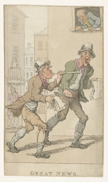 Curator: Here we have "Drovers with a Pair of Rearing Horses," a watercolor and ink drawing attributed to Thomas Rowlandson. Editor: It's so chaotic. The movement feels frenzied, almost violently energetic. Are these horses fighting? The men look like they're in distress too. Curator: Rowlandson often used caricature, and you certainly see that here. The exaggerated expressions—the wide eyes, the gaping mouths—emphasize the drama of the scene. He seems interested in capturing the emotional extremes. Editor: It’s striking how raw it feels. The use of line, so loose and unrefined, suggests an urgency. Is this a criticism of the social hierarchy, or a commentary on human hubris perhaps, imagining our attempt to control these majestic creatures? Curator: Perhaps. The symbolism of the rearing horse can be multi-layered. In Western art, it has often represented power, virility, even nobility. But here, those connotations are subverted. There’s struggle, not triumph. It seems to tap into a kind of timeless human drama. We want to domesticate and the natural world resists. Editor: And it raises questions of exploitation and the ethics of animal labor, which given the historical context of rural England, connects directly to class disparities and power imbalances. Rowlandson might be showing us that those perceived as superior in society are as fallible as their methods for maintaining order. Curator: It makes you think, doesn’t it, about our continuing negotiation with forces both external and internal. How we strive to manage both our world and our own volatile selves. Editor: Indeed. It really makes one wonder what’s raging beneath the surface in our own encounters. This raw expression captures such inner turmoil. Curator: Yes, Rowlandson leaves you wrestling with something unsettlingly familiar, and that resonates. Editor: Precisely, and perhaps inspires us to approach control and domination with a critical eye.