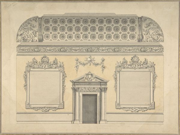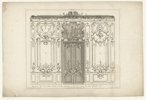 Curator: I am struck by the detail; there's a fragility, almost lace-like. Editor: Delicate, yes, but also opulent! We are viewing "Vensters en Spiegels," which translates to “Windows and Mirrors." The engraving, dating from 1733 to 1768, is by Carl Albert von Lespilliez and resides here at the Rijksmuseum. It feels very much of its time, wouldn't you agree? Curator: Absolutely. The Rococo style leaps out, but the mirrored surfaces... that's what captures my imagination. Mirrors hold so much symbolic weight – reflections of the self, hidden truths. I wonder what kind of status it conveyed in that moment to possess or commission that piece for your household? Editor: Rococo speaks of excess, of aristocracy insulated from reality. But mirrors, as you say, present possibilities, reflections, or deflections, depending on your position. Windows onto new experiences, even perhaps a reflection of class. Curator: Indeed. It seems, in those upper echelons of society, that beauty was a coded language – everything communicating something beyond the surface, from overt political commentary to status projection, as the aristocracy asserted its identity to itself and the world around it. Editor: Right. You think about who is reflected within those frames: wealth, beauty, power... certainly not the faces of those who made it all possible. Those windows only show us certain things. This engraving in turn mediates what could have been the experience of witnessing oneself in the glass and then experiencing the gaze of the elite patrons within this context. Curator: I agree, though perhaps an object can transcend its origins; a symbol evolves with each gaze directed its way. What stories will this intricate Rococo drawing suggest a century or two from now, and what meanings might we layer onto its already ornate design? Editor: That's the beauty of it. It's never truly finished. These objects accumulate and shed meanings depending on the context and who's in the room. We need to acknowledge whose gaze isn't reflected here in this very stylized image. Curator: A crucial point to always consider. This image gives a new window into the many layers that make an art piece important in cultural understanding. Editor: Indeed. "Vensters en Spiegels" offers us a complex and beautiful array of connections to society's reflections, which continue to offer new insights over time.