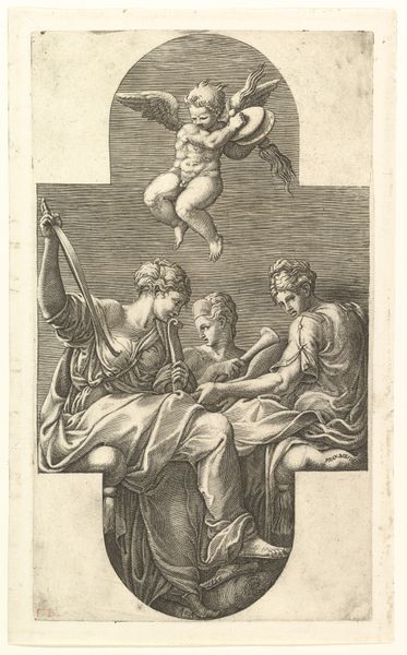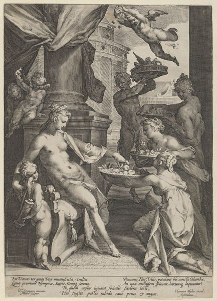 Editor: This is "Bacchus, Music, Amor" made between 1575 and 1600 by Johann Sadeler I, currently housed in the Met. It's an engraving filled with symbolic figures. The composition feels quite theatrical, almost like a stage setting. What can you tell me about the context of this work? Curator: It's fascinating to consider how engravings like this circulated ideas in the late 16th century. Notice the inscription dedicates the work to a noble. How might prints such as these have served the socio-political aims of both the artist and the patron? Editor: That's a great question. Maybe the noble wanted to associate himself with classical themes of abundance and pleasure? It feels like strategic self-promotion. Curator: Exactly! And think about the function of allegory here. Why not portray the patron directly? What’s gained by representing power and status through Bacchus and Amor? Consider the broader context: the Holy Roman Empire, patronage networks... Editor: Hmm, making it allegorical maybe elevated it, connecting the patron to timeless, classical virtues rather than just everyday power. Were prints like these widely accessible, or mostly for an elite audience? Curator: Initially, probably more elite, considering literacy rates and collecting habits. But engravings have the potential for wider distribution than unique paintings, and their images could be reinterpreted and reproduced in various media. This democratizing aspect of print is significant. Do you see the text on a tablet there? It contains an epigram by Alciato, does that play into accessibility? Editor: I do! It suggests that understanding requires classical education. It adds a layer, separating those "in the know." This makes the print a display of status in itself! Curator: Precisely. And the Met's display of this print, its preservation, continues this act of institutional validation and gives meaning in the present day. It influences its continued reading. Editor: I hadn't thought about that – how the museum itself frames our interpretation. I’m learning how the meaning of the work doesn’t just come from the artwork itself. Thank you! Curator: Indeed. It’s about how art exists within systems of power and representation throughout history. A perspective I am glad to have shed light on.