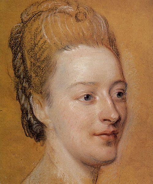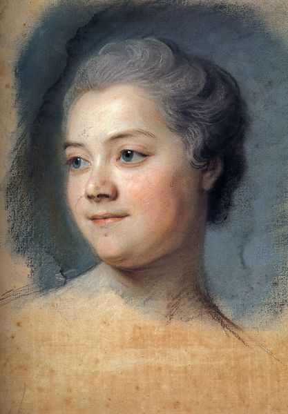 Curator: Ah, here we have a captivating portrait, rumored to be of Madame de Pompadour by Maurice Quentin de La Tour. Note the exquisite use of pastel as the chosen medium. Editor: What strikes me immediately is its ethereal quality, like a half-formed dream. The texture, particularly the blending of hues around the face, is remarkable. Curator: Precisely. The application of pastel allows for subtle gradations and a softness that perfectly captures the Rococo aesthetic, even if unfinished. Consider the nuanced color palette, primarily subdued pinks, blues, and oranges—an aesthetic that enhances the sitter's demureness. Editor: The ambiguity really sings, though. I feel a profound stillness about the piece. Like she's paused in a moment of reverie, maybe even sadness. The unblended edge gives it a sense of immediacy, too—raw emotion breaking through. Curator: The gaze, directed slightly off to the left, invites speculation. Is it a longing look, or perhaps a fleeting thought? Also, the contrast between the soft, diffuse facial features and the somewhat roughly defined background adds a layer of formal complexity. Editor: Yes! It almost isolates her, but in an empathetic way. We're sharing this moment with her, intruding almost—an amazing feat of intimacy created with smudged chalk. It's romantic, even with those slightly unnerving eyes! Curator: The choice of pastel further supports that mood, offering the artist a direct, tactile engagement with the paper surface, unmediated by brushes or solvents, resulting in this raw, honest aesthetic you perceive. Editor: So, less a detached observation and more like feeling someone's breath on your face. A very human portrait indeed. This artwork stays with me in some deep, internal, silent way. Curator: It allows one to engage deeply with form, structure, and emotional expression within the frame. Editor: Exactly. I could gaze upon its quiet drama all day, every day.