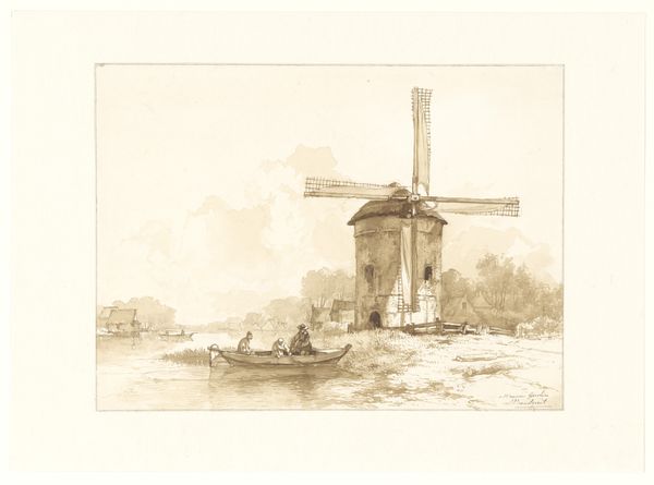 Curator: Looking at this pencil drawing, "Molen aan het water met rondom drie figuurstudies" by Paulus Lauters, created sometime between 1828 and 1849... well, it feels like peering into a forgotten storybook, doesn't it? Editor: It certainly evokes a feeling of nostalgia, yes. The soft gradations of the pencil, combined with the subject matter—a tranquil waterside mill scene augmented with snapshots of local figures—creates a compositionally unconventional yet emotionally coherent scene. Curator: Exactly! And these figure studies sort of floating around the central windmill…it’s almost like Lauters is saying, "Here are the inhabitants, but also the character of this place!" There's this elderly woman with a cane, a group seemingly bartering. The placement is unusual. Editor: Precisely. One could argue these “floating” vignettes exemplify a pre-cinematic montage effect—each figure group offers a narrative window that amplifies the semiotic density of the main subject, the mill. We interpret this effect through compositional asymmetry: a clear departure from academic rigidity which speaks, I think, to emerging aesthetics centered on immediacy. Curator: Immediacy is a perfect word for it. You almost get the sense that Lauters isn't trying to render perfection, but capturing the ephemeral, like snapshots of life that happen when no one's watching. Maybe it has a dreamlike state to it... something about windmills and old people puts me in that cozy headspace... I see it more of like an old diary. Editor: In a structuralist framework, Lauters has cleverly intertwined form and function, employing a technique—sketching—traditionally used for preliminary work and elevating it to high art. We have themes associated with Romanticism and also traces of early Realism in the artist’s detailed but sympathetic depiction of everyday individuals and locations, Curator: That really sums it up; something genuinely 'everyday', immortalised on paper... like catching wind of the real. Editor: Indeed. By embracing simplicity in both subject and style, Lauters offers us an intimate portrayal that whispers rather than shouts its significance.