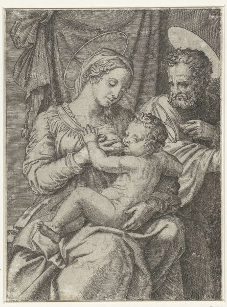 Editor: Here we have Francesco Cozza’s engraving, “Virgin and Angels Watching Over the Sleeping Infant Jesus." I'm immediately struck by the density of the lines, the way they build up texture. It feels almost sculptural despite being a print. How would you interpret the choices Cozza made in producing this image as an engraving? Curator: Well, let's consider the material constraints. Engraving, especially at this level of detail, is laborious. Each line is etched, a deliberate act of production. The *reproduction* of religious imagery through prints speaks volumes. Think of the social context: prints made art more accessible, but also dictated the means of its dissemination and control. The choice to depict this scene in an engraving rather than a painting has implications for both the artist's labor and the artwork's accessibility. Editor: So you're saying the choice of engraving itself is a statement, relating to both the physical labor and the print's potential to spread ideas? Curator: Precisely. And it forces us to consider who controlled the reproduction, and the possible audiences this work served. Did Cozza produce it himself, and distribute, or were other workshops or institutions involved in creating these prints? How did *that* process impact or recontextualize the initial artistic labor of the engraving? What do the qualities of the print’s texture, that density of line that you noticed, tell us about workshop practices at this moment in time? Editor: That makes me think differently about what might be seen as simple devotion, seeing as this image may have circulated in multiple places beyond a church setting, making accessible a representation previously afforded through different channels of viewership. Curator: Exactly. It becomes an artifact of its own production. Editor: Thank you; I'll definitely remember to think about the social implications of the process in future engravings. Curator: Remember: art is always an object embedded within social and material networks.