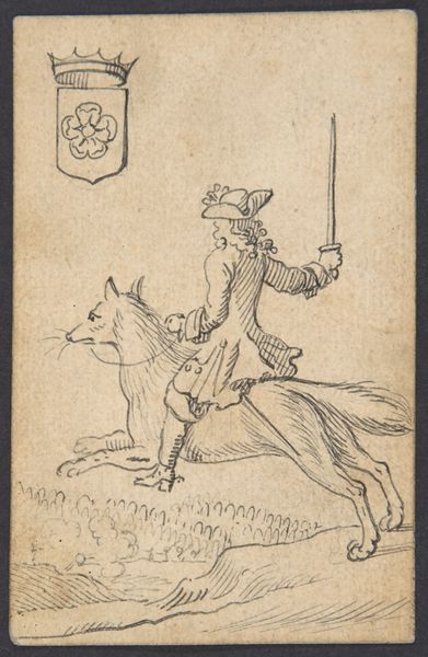 Johannes Brandenberg created this detailed pen and brown ink drawing, "Acorn King: A Man Astride a Cow," most likely in the late 17th or early 18th century. The composition, within a small rectangular format, is dominated by the figures of a well-dressed man riding a cow. Brandenberg’s drawing employs line and form to create a playful and satirical scene. The lines are delicate yet precise, defining the textures of the man's coat and the cow's hide. The subject is unusual, perhaps destabilizing the established meaning of nobility by placing a 'king' on such a humble animal. The inclusion of a coat of arms featuring an acorn hints at a symbolic game, perhaps critiquing social structures or class pretensions. The drawing uses its whimsical imagery to question fixed meanings, inviting viewers to interpret its cultural codes. This piece functions not just aesthetically, but also as a cultural commentary, engaging with social and philosophical discourse.