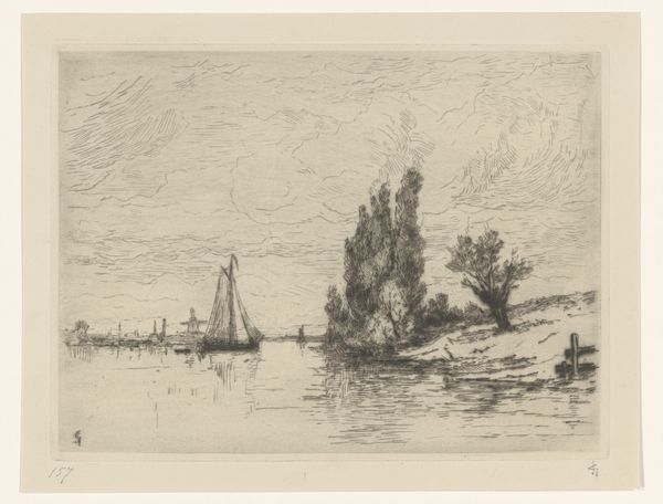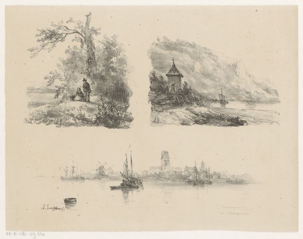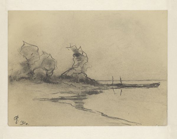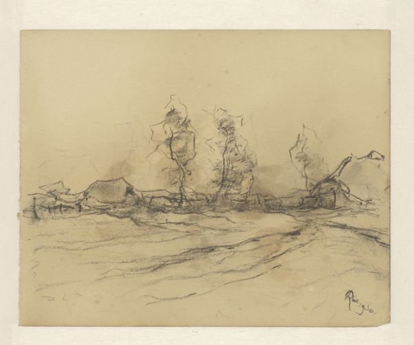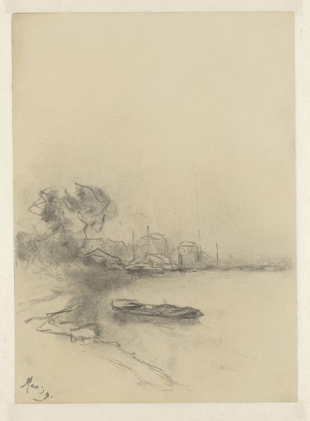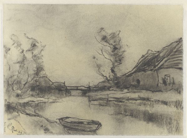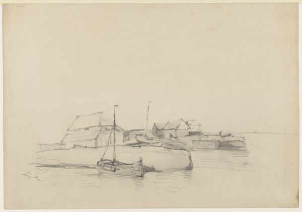 Editor: This is a pencil drawing called "Zeilend schip, boerderij en hooischelf" – that's "Sailing Ship, Farm and Haystack" in English – created in 1929 by Pieter Ras. The muted tones and sketchy style give it a rather melancholic, almost dreamlike quality, don’t you think? What strikes you most about this piece? Curator: Indeed. Beyond the immediate pastoral scene, consider how such images – the boat, the farm, even the humble haystack – tap into a deep well of cultural memory. These are emblems of a connection to the land, to simpler times, perhaps. Do you see how the artist uses these symbols to evoke not just a place, but a feeling, an atmosphere? Editor: I hadn't thought about them as symbols exactly, more just…things. Curator: Think of the boat. Is it merely a means of transport here, or could it represent a journey, exploration, or even escape? And the haystack—a symbol of harvest, provision, the cycle of life, all rendered in this hazy, almost ephemeral way. What feeling does that evoke? Editor: It makes it seem…fragile, I guess? Like it could all disappear. Is that intentional, do you think? Curator: It's a feeling that’s intensified through the lack of sharp lines. Ras uses the pencil to capture fleeting moments, blurring the edges, almost as if time is already at work, softening the scene in our memory. How does that speak to a wider sense of change and loss that permeated that time period? Editor: I guess it’s about the passing of time. The drawing is not just about the specific place but something bigger. Curator: Precisely! These everyday images, imbued with symbolic weight, become a powerful commentary on cultural continuity, and also inevitable transition. What a poignant reminder of how even seemingly simple scenes can resonate with deep emotional and historical meaning. Editor: This has totally changed how I look at what I thought was just a simple sketch. It's amazing how much symbolism can be packed into a seemingly ordinary scene. Curator: Absolutely! The power of art lies in its ability to tap into these collective memories, inviting us to contemplate our place within the larger narrative of history and culture.