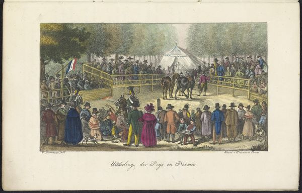 "Zonnewijzer van het Palais-Royal," or "Sundial of the Palais-Royal," was created by Adrien Victor Auger in the early 19th century as part of the series "Tableaux de Paris." It gives us a glimpse into Parisian society during the Restoration period. The print depicts a bustling scene in the gardens of the Palais-Royal, a place that was then a hub of social activity. Auger captures the complexities of class, gender, and identity of the time through the varied characters in the park. We see gentlemen in top hats, a fashionably dressed woman, and street urchins, each representing a different facet of Parisian life. The sundial itself, and the firing of the cannon, becomes a focal point around which these social interactions play out. Auger subtly critiques the social norms and hierarchies of his time. The emotional tenor of the scene is palpable, with the artist capturing the anxiety and excitement of a society in transition. The artist develops a narrative that invites us to reflect on the ever changing dynamics of social status.