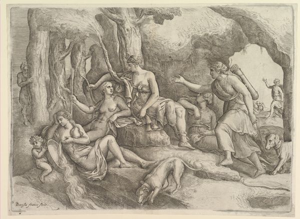 Curator: This drawing, called "Nymphs and Satyrs Playing Musical Instruments," is by Claude Lorrain. While undated, it's a beautiful example of his work in ink, pen, and paper, currently held at the Art Institute of Chicago. What catches your eye? Editor: Initially, I'm struck by its hazy atmosphere and the clear erotic undertones of the reclining nude set amongst what look like musical revelers. It feels… charged. Is this intentional? Curator: Lorrain’s landscapes often evoke an Arcadian Golden Age, looking back to classical mythology. Here, the figures and the music-making contribute to a narrative tradition, hinting at a kind of erotic escapism within the confines of a cultivated elite audience of his time. It's about pleasure and refined leisure, painted with almost frenetic, quick brushstrokes. Editor: It's a fascinating insight. But beyond the 'Golden Age,' how does Lorrain engage with power dynamics of the male gaze with the female body laid bare in plain sight? Are we, the viewers, meant to participate in this scenario? And also, who gets to participate, even indirectly? Curator: These are pressing points to consider when we analyze the historical consumption of images like these, and who and what were they designed to gratify in its historical context. During this era, idealized depictions of female figures often circulated among privileged male elites as demonstrations of aesthetic taste and erotic capital. This can perpetuate systemic biases regarding gender, power, and agency within visual culture. Editor: Exactly. This invites us to reflect on the continued presence of historical injustices, raising complex questions about representation, desire, and societal norms. The fact that this work is presented for viewing to anyone begs for accountability, prompting an ongoing inquiry into art’s ability to confront power imbalances and social values. What could the value of an artwork like this one be, today? Curator: I suppose that for today's audiences it can prompt dialogues and foster a greater sensitivity toward representational challenges related to this and other genre paintings and landscapes. As an art piece it invites us to scrutinize the systems and power relations through which artworks acquire significance, and also as a form of societal preservation it helps us question the norms, standards and conventions in art-making processes that often went unchecked during the artwork’s own period. Editor: So it is by deconstructing these imageries that we open avenues for inclusivity. In turn, we create a platform that allows other narratives that have historically been overlooked and silenced. It creates an open space for debate, I hope.