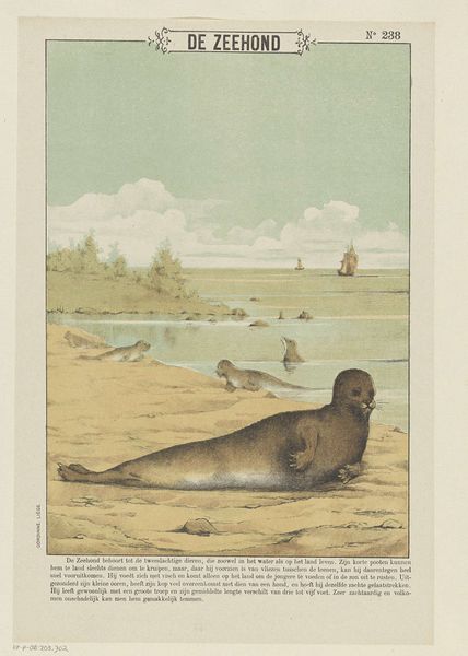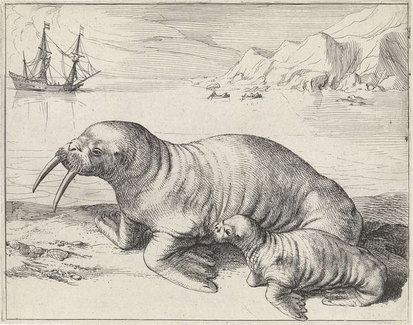 This print titled 'Seehund', by firma Joseph Scholz, presents a composition dominated by the imposing forms of seals against an arctic backdrop. The artist uses linear hatching to model the bulky forms of the seals in the foreground. Their texture is further emphasized by a subtle palette of browns and grays, bringing a tactile quality to the depiction. The arrangement of the seals, with one in the foreground and others receding into the distance, establishes a clear spatial hierarchy. The backdrop of jagged ice formations rendered with quick, thin lines adds to the dramatic effect, suggesting both the beauty and the harshness of the arctic environment. The layering of forms—seals in the foreground, ice formations in the back—creates a structured visual field. This print functions not just as a naturalistic representation but also as a constructed image, carefully arranged to convey a certain vision of nature. Notice how the lines delineate form, and how the strategic use of light and shadow contribute to the volume of the subjects, emphasizing their physical presence.