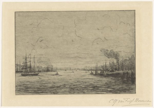 Editor: Here we have "Harbor View with City Hall in Vlissingen," an etching by Carel Nicolaas Storm van 's-Gravesande, made sometime between 1887 and 1902. It feels somber, almost bleak, in its depiction of this Dutch port city. What strikes you when you look at this piece? Curator: The etching technique itself contributes to that mood. Look at how the fine lines create a sense of depth, but also a certain ambiguity. Consider, too, the weight of the symbolism inherent in a harbor. Ports represent transitions, departures, and returns. What cultural memory do you think it evokes? Editor: I suppose a lot of the feeling comes from the way he portrays the sky - so heavy with clouds. And there's something about the contrast between the solid buildings and the implied movement of the water. Curator: Indeed. The sky speaks volumes, doesn't it? It could symbolize a restless, uncertain future. And what of the vessels themselves? Ships are more than just modes of transport; they're powerful emblems of exploration, commerce, and even conflict. Do you think that is conveyed? Editor: It's there, subtly. The ships almost look tired. And it’s interesting you mention that this etching technique seems ambiguous: the city buildings and their reflection are also quite faded as well. It doesn't seem to reflect optimism and confidence. Curator: Perhaps the artist intended to express the passage of time and inevitable change to maritime activities through a realistic but nuanced portrait. Storm van 's-Gravesande lets us explore this harbor not just as a place, but as a repository of cultural history and the human condition. Editor: I now appreciate that there are different ways of interpreting it and what is conveyed through a specific technique and imagery. Curator: Absolutely, and by looking at art from different angles, and with a sensitivity towards the artist’s context, it will provide invaluable insights.