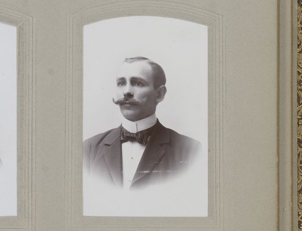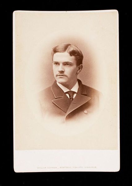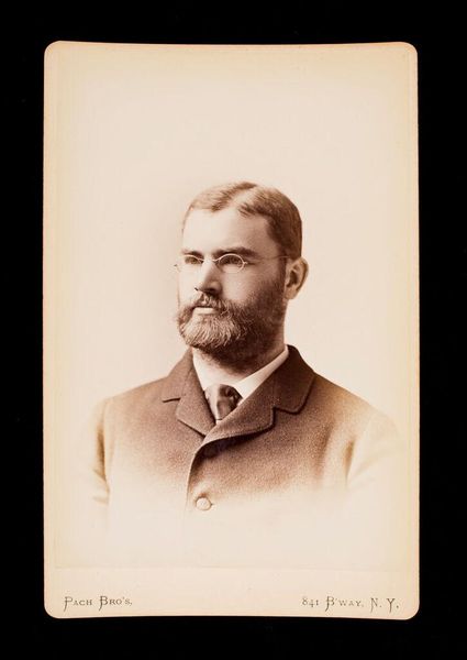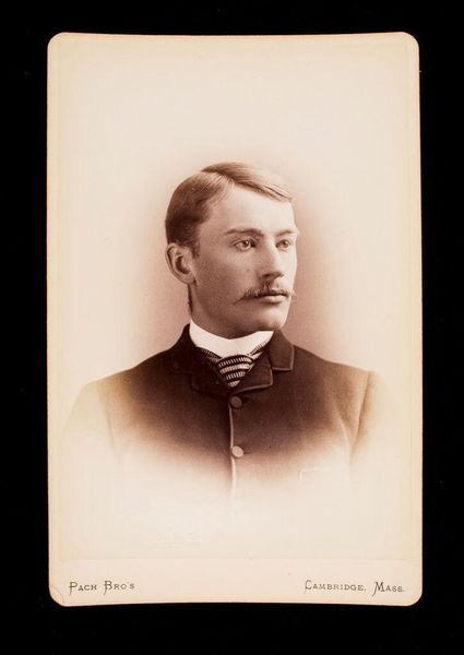 Curator: Looking at this portrait, I immediately feel a sense of quiet dignity, almost a somberness. The sepia tones contribute to the feeling of stepping back in time. Editor: Indeed. This is a photograph of Benjamin Osgood Peirce, taken by Pach Brothers, and housed here at the Harvard Art Museums. Consider the context of portraiture in the late 19th century. It was a means of establishing and conveying social status. Curator: Absolutely, and the formality of his attire, the carefully groomed mustache and sideburns, speak to a certain performance of masculinity. Was this how Peirce wanted to be seen? What does it say about the societal expectations of men during this time? Editor: I think you're right. Pach Brothers, with their studio prominently displayed on the card, catered to a specific clientele, shaping narratives for prominent figures and institutions. Curator: So, this image isn't just a picture of a man, but a carefully constructed representation intended for public consumption and perhaps, future remembrance. Editor: Precisely. Thinking about it, this work reminds us that even seemingly straightforward portraits are deeply embedded within layers of socio-political meaning. Curator: It has made me think about who gets remembered through portraiture, and what messages these portraits continue to convey. Editor: And for me, it underscores the powerful role photography played in shaping public perception and solidifying social hierarchies of the past.