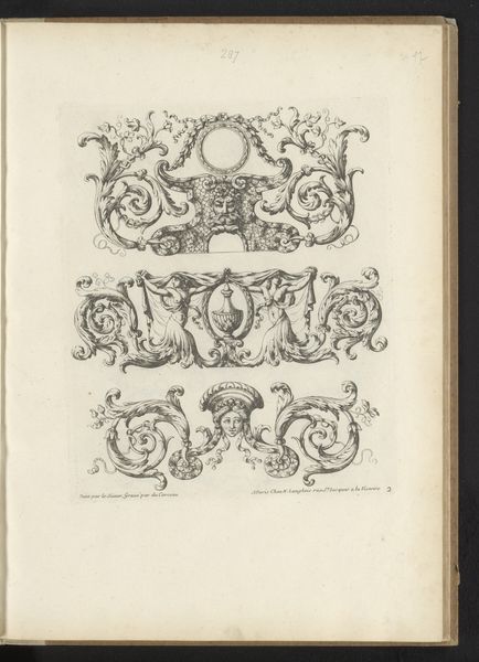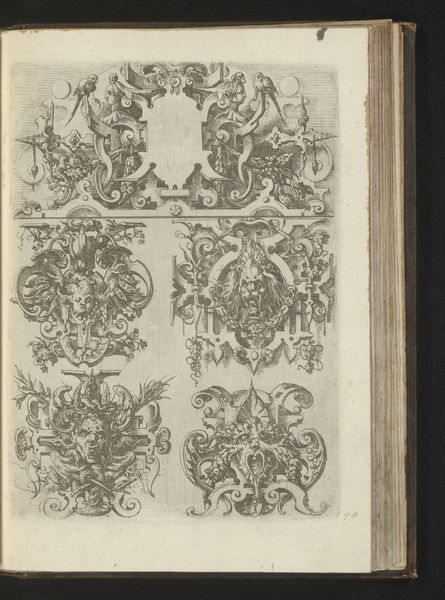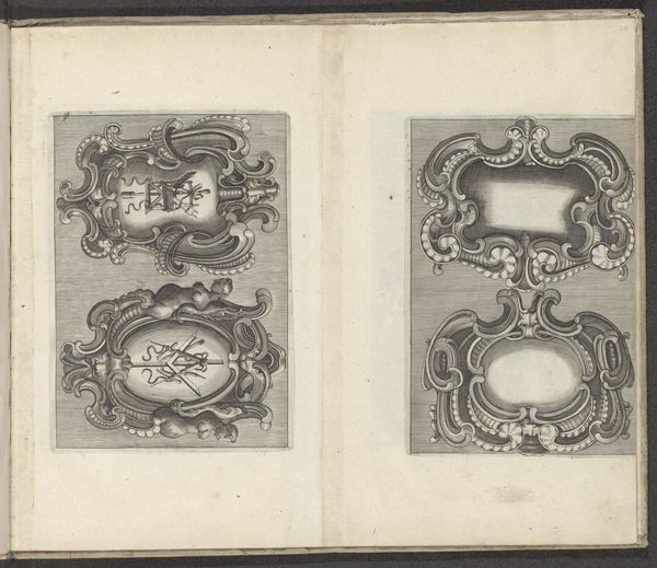 These paired images, titled "Vier ornamenten in kwabstijl," present a study in the baroque possibilities of form. Executed by an anonymous artist, these prints showcase the 'kwabstijl,' or auricular style, characterized by fluid, organic shapes. Observe how the artist uses line and form to create a dynamic sense of movement. The shapes undulate and interlock, suggestive of cartilage or sea creatures. The intricate details, rendered with delicate lines, invite close inspection, while the contrast between the solid forms and the empty spaces creates a visual rhythm. Notice how the interplay of positive and negative space challenges our perception. Are these forms emerging or dissolving? This ambiguity destabilizes traditional notions of form and function. The lack of clear boundaries blurs the distinction between the object and its surroundings. It suggests a world in constant flux. Ultimately, these prints invite us to question the nature of form. How do we define boundaries? How do we perceive the relationship between the solid and the void? These questions remain relevant, encouraging us to engage with art as a space for ongoing inquiry and interpretation.