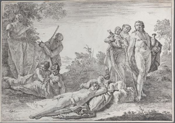 Editor: Here we have "A Bacchanal", an oil painting by Sebastiano Ricci. It's a riotous scene, a celebration. All this fleshy energy reminds me a bit of a Renaissance party gone wild. What’s your take on it? Curator: It's more than just a party, though isn’t every great party, at its heart, something much more profound? For me, the Bacchanal isn't only Venetian exuberance on canvas, it's a conversation. See how Ricci subtly balances the figures. He pulls the eye back and forth creating a push and pull – sensuality tempered by a knowing gaze. Doesn't the rosy blush on every cherubic cheek mirror the fleshy celebration, creating an inviting visual dialogue? Editor: I can see that. The way he's placed the figures definitely creates a sense of balance, but all those bodies make me think of excess. How much of that would you say comes from Venetian painting in general? Curator: Good question. Venetian painting often does trade in that abundance. The sumptuous colors, the rich textures – it all points to a society that reveled in the material world. But Ricci, unlike some of his contemporaries, tempers this excess with a lightness of touch, a breezy elegance. There is an earthly paradise in Venice as a dream of lavish earthly life with art enriching the viewers' sense of reality and imaginative freedom. Editor: That’s a really interesting point. It is exuberant, but somehow still quite refined. Is it possible to create something wild while remaining composed? Curator: Isn’t that the central tension of the human spirit? The Bacchanal teaches me that pleasure and art are in play within structure, chaos rendered beautiful, and those opposing forces exist side by side, don't they, just like the dance between abandon and awareness on this canvas. Editor: So it's about embracing both sides. That’s given me a completely new perspective on the piece, thank you. Curator: My pleasure; anytime to explore life!